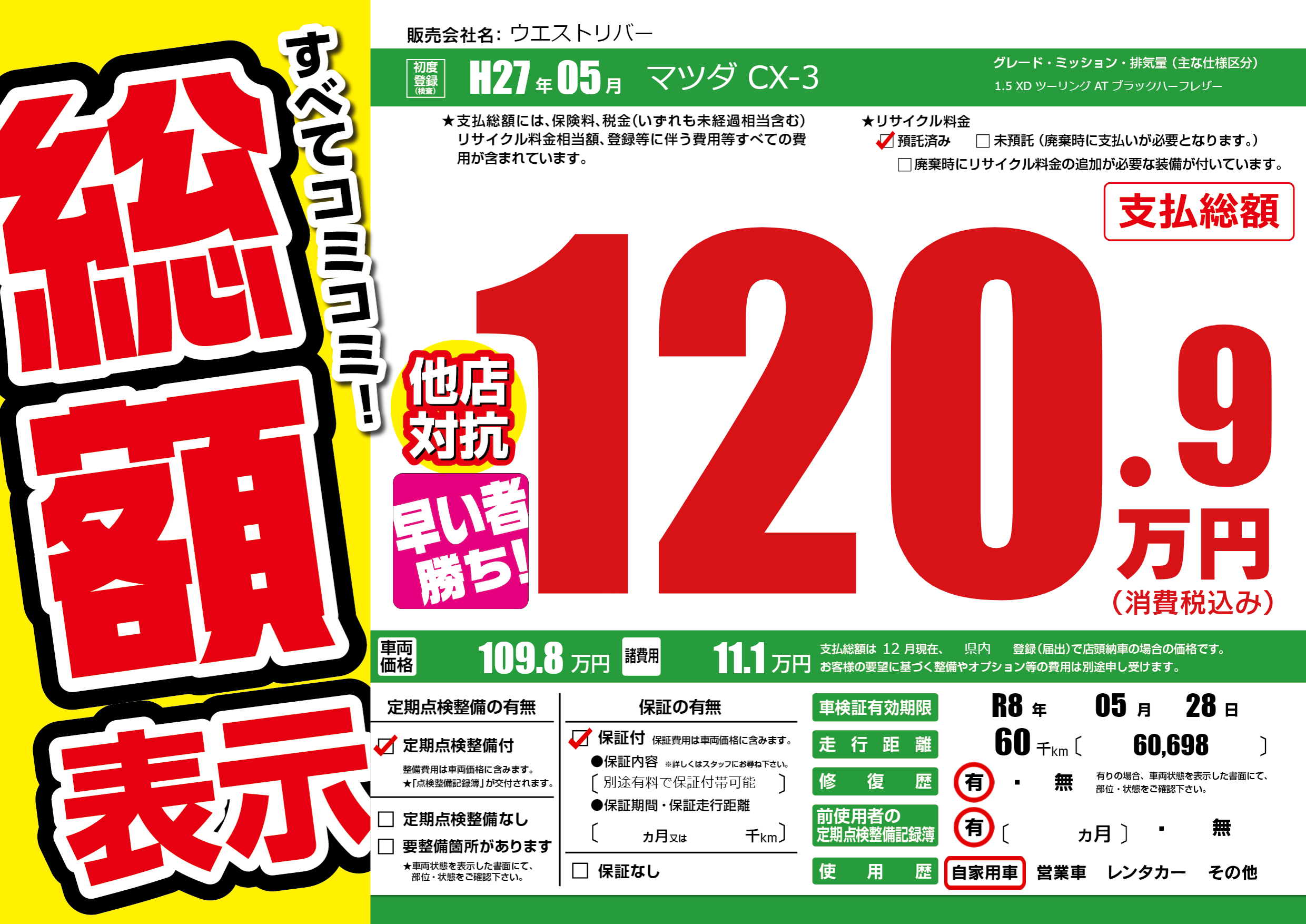| 走行キロ | 6万km | 初年度登録 | H27年05月 |