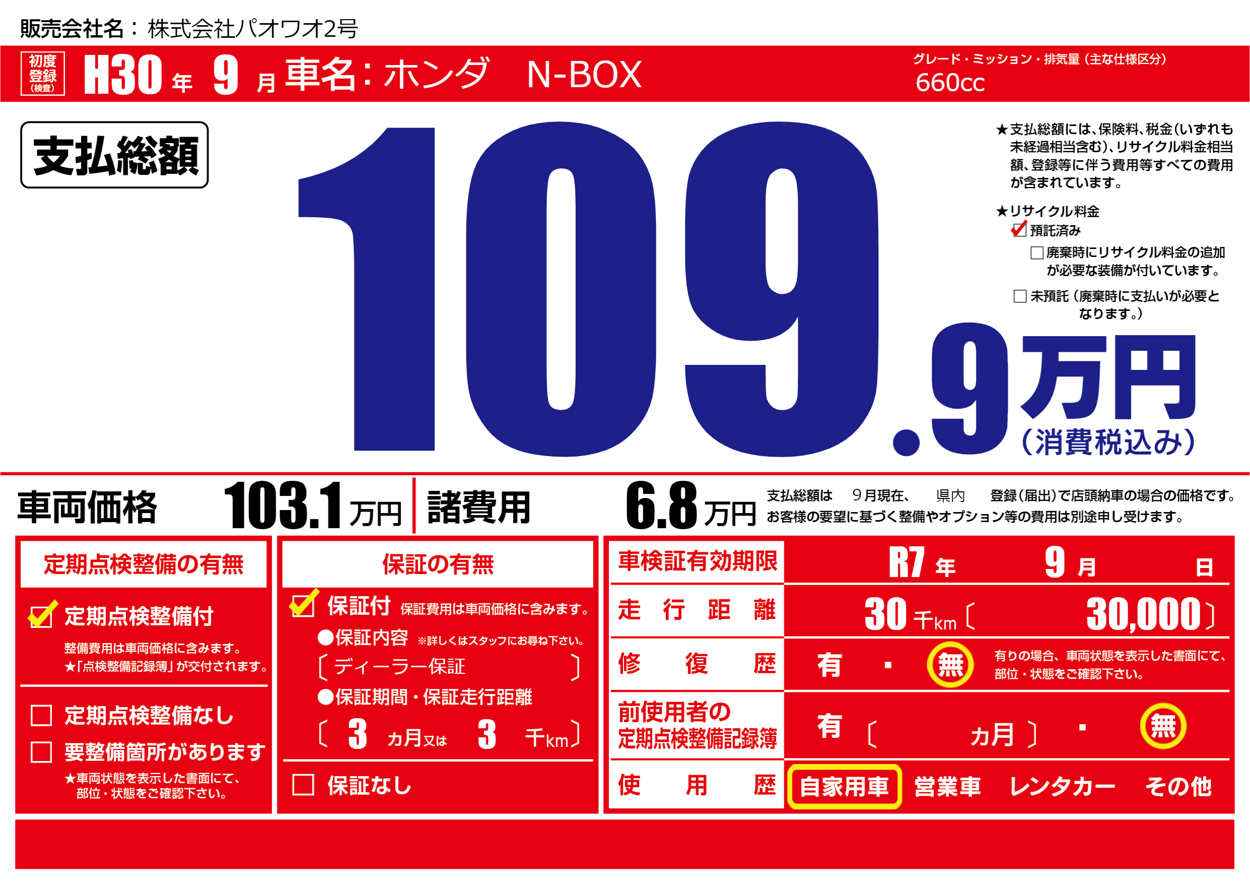 | 走行キロ | 3万km | 初年度登録 | H30年9月 |