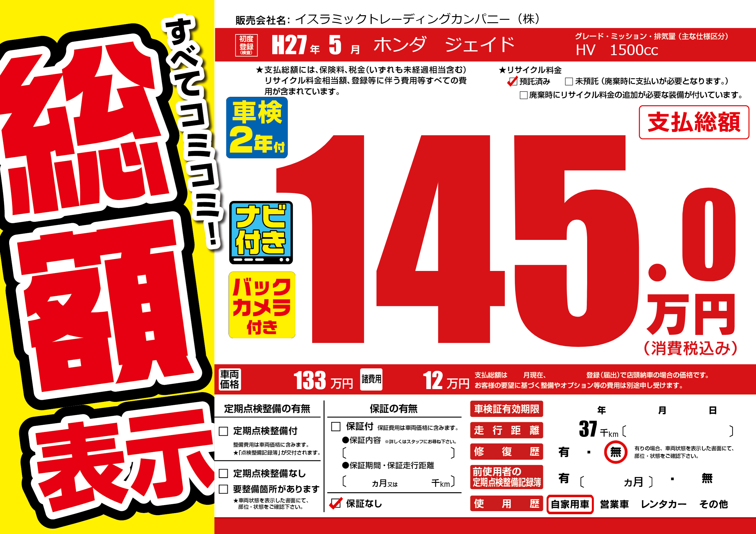 | 車名 | ホンダ ジェイド | グレード ミッション 排気量 |