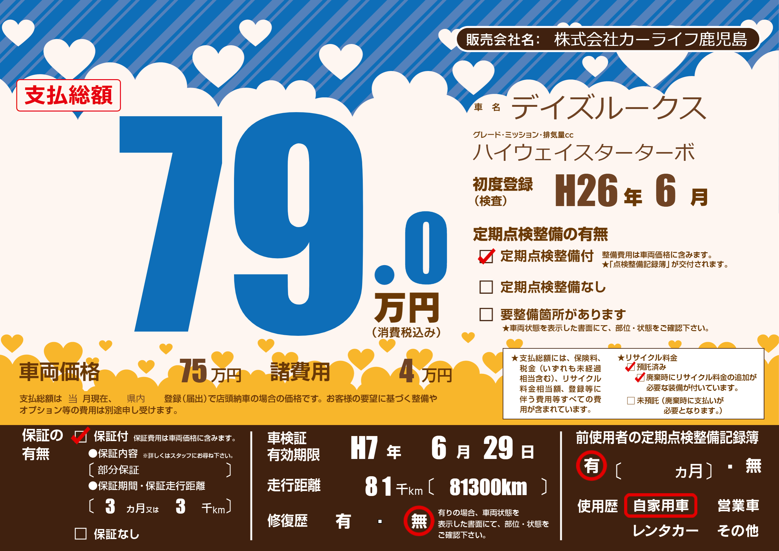 保証付き 保証内容(部分保証) 3ヶ月または(3)千kmまで |