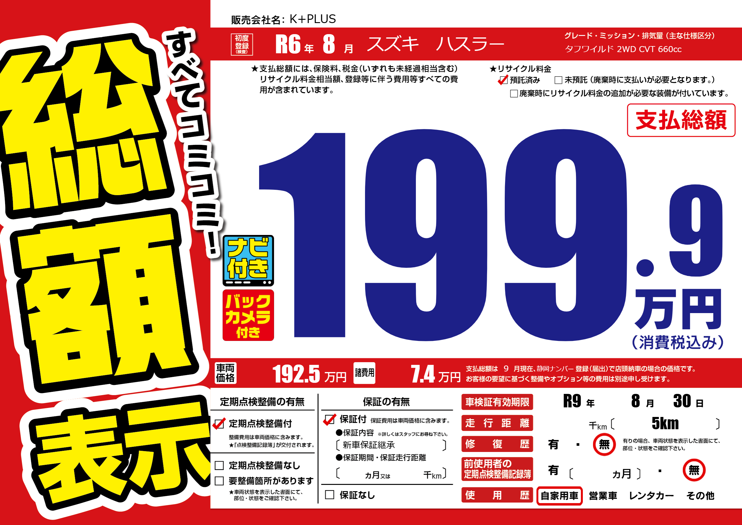 | 車名 | スズキ ハスラー | グレード ミッション 排気量 |