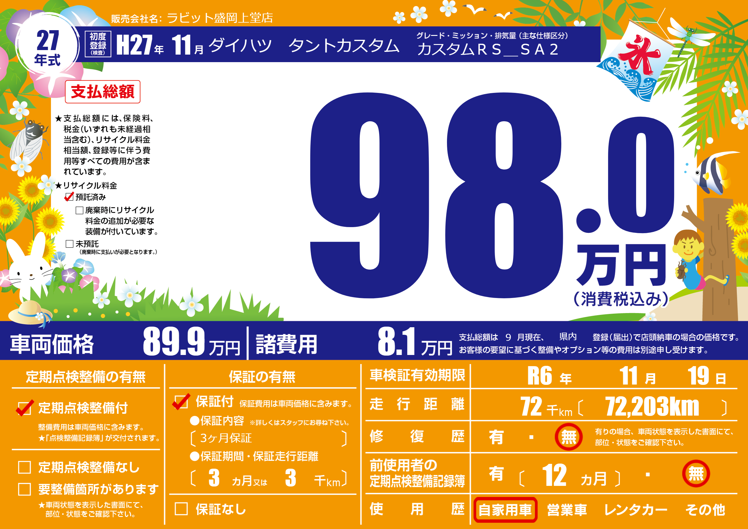 | 走行キロ | 7.2万km | 初年度登録 | H27年11月 |