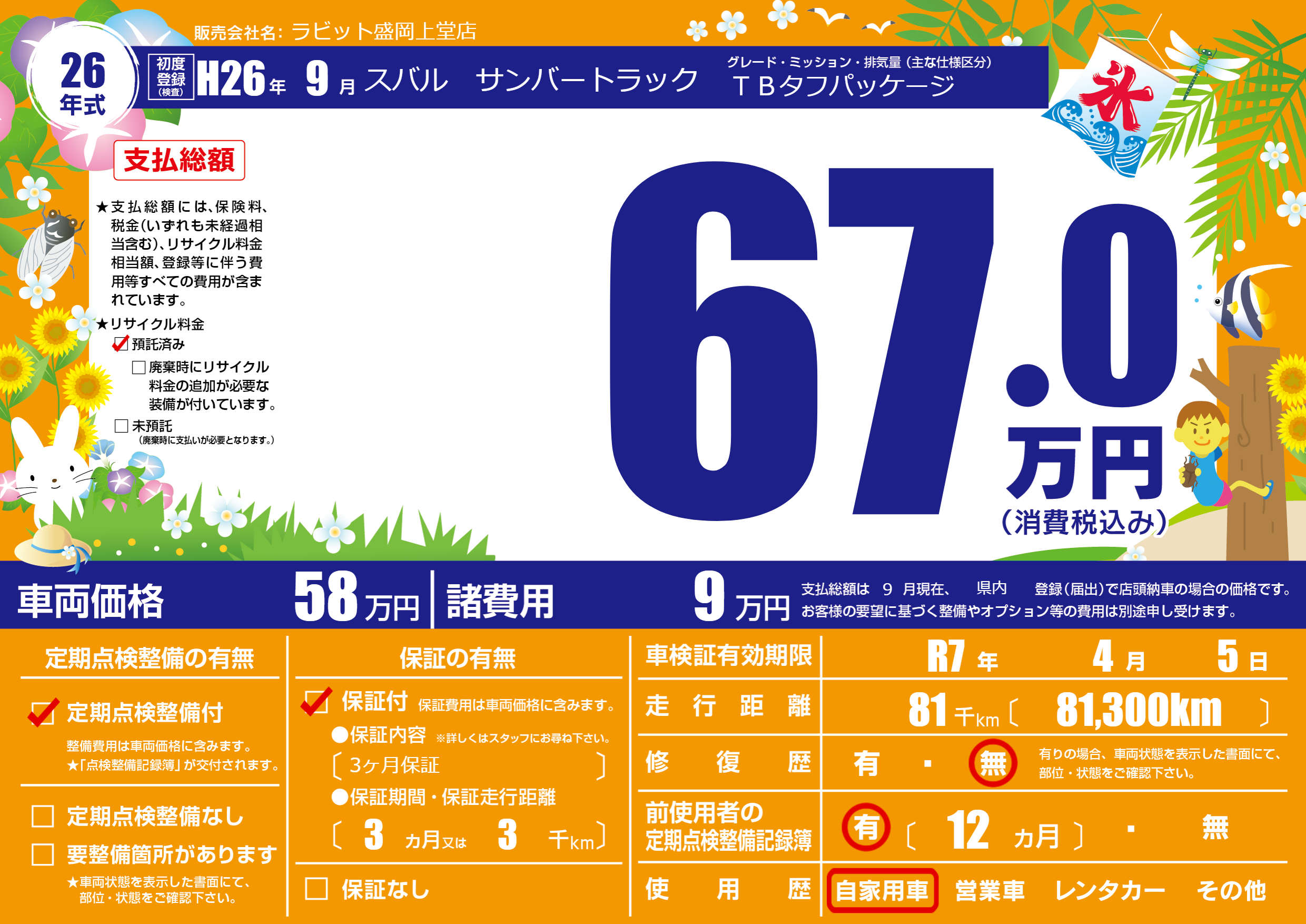 | 車名 | スバル サンバートラック | グレード ミッション 排気量 |