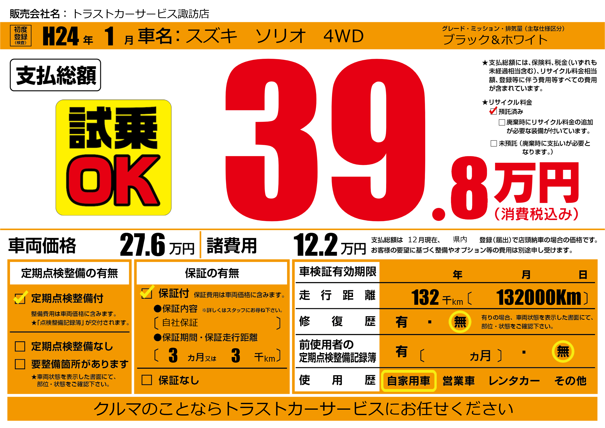 | 車名 | スズキ ソリオ 4WD | グレード ミッション 排気量 |