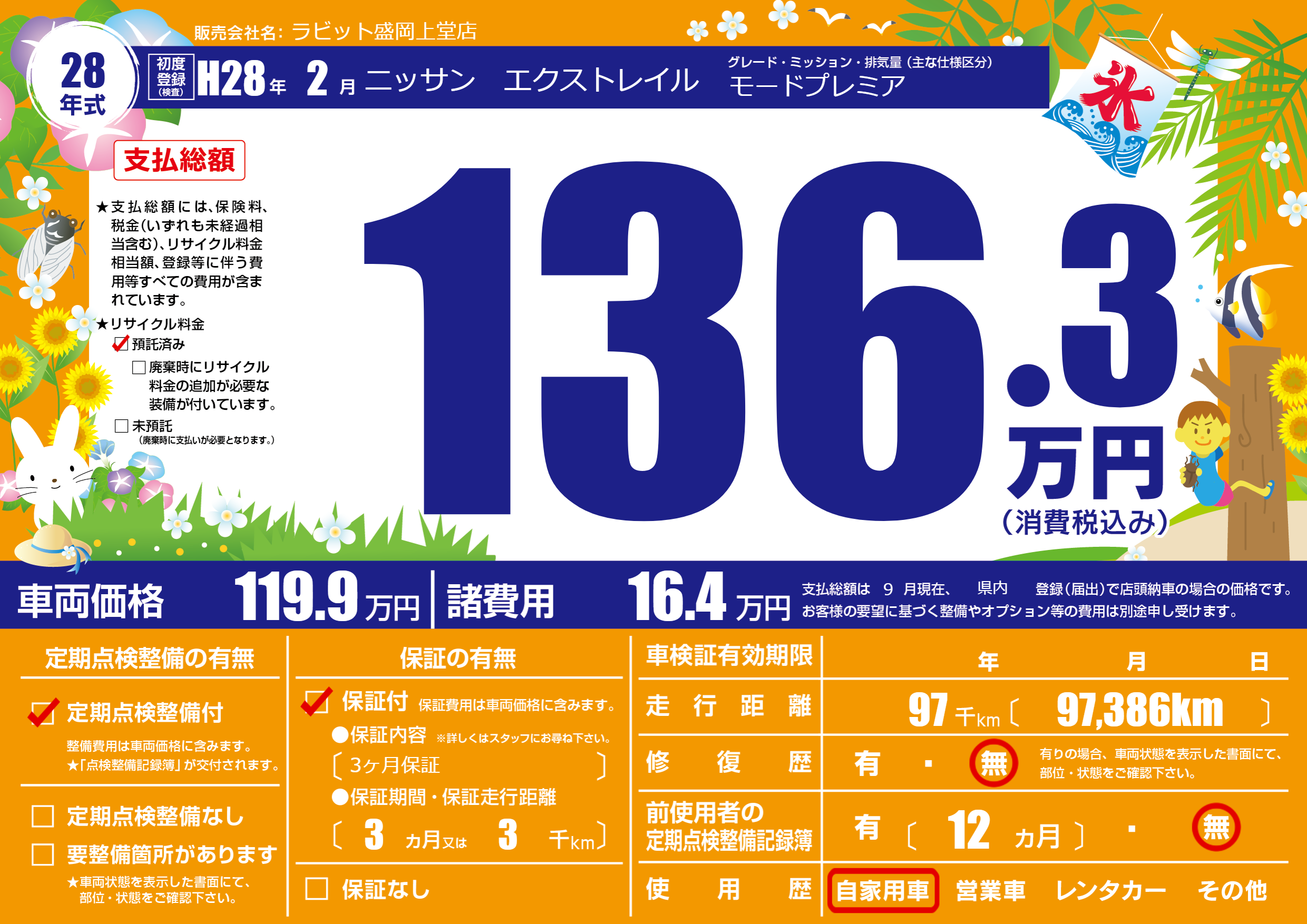| 走行キロ | 9.7万km | 初年度登録 | H28年2月 |