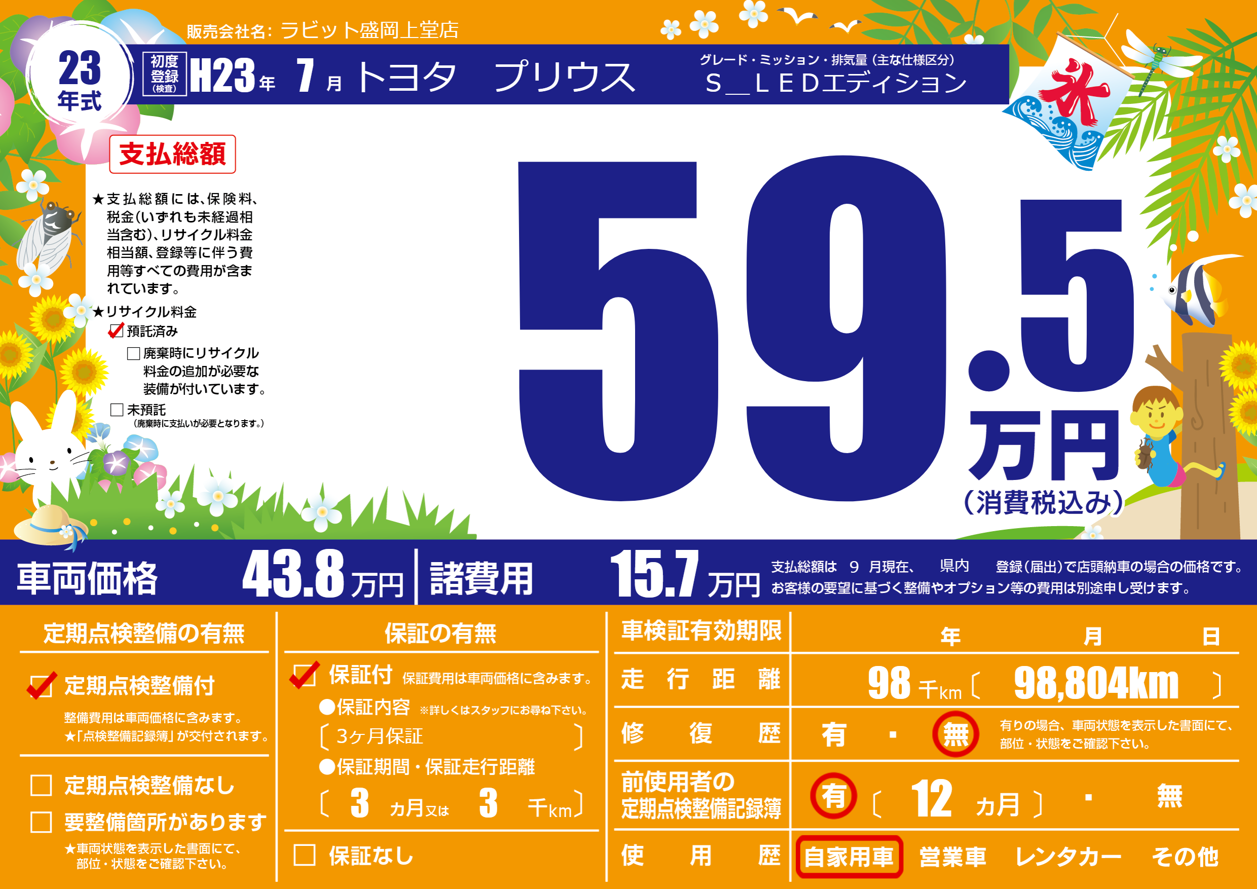 | 走行キロ | 9.8万km | 初年度登録 | H23年7月 |