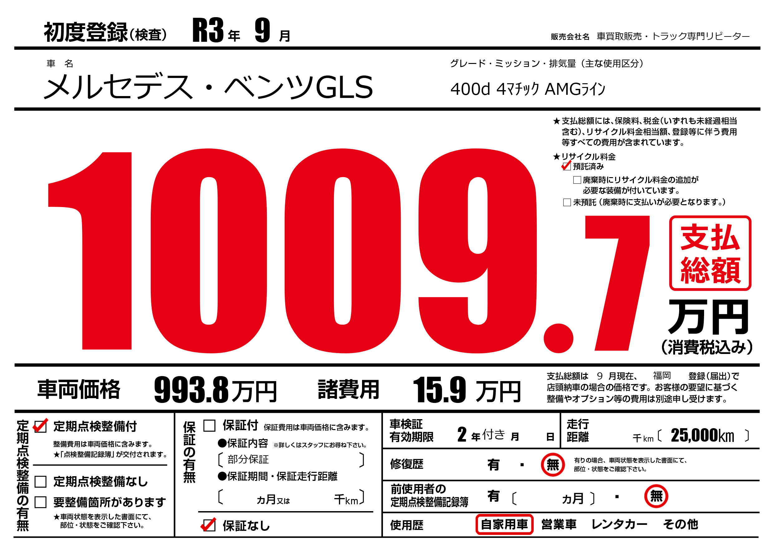 | 車名 | メルセデス・ベンツGLS | グレード ミッション 排気量 |