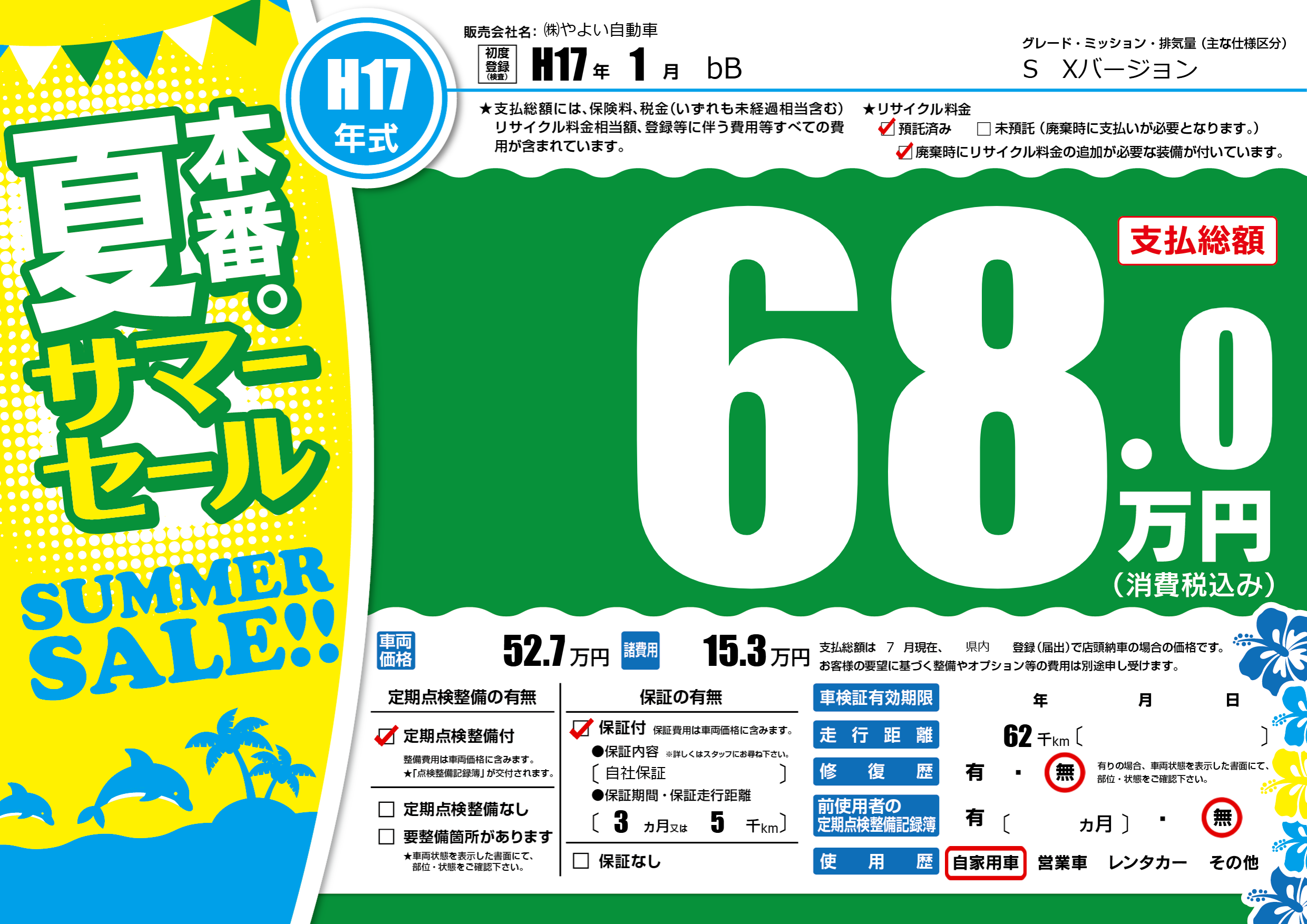 | 走行キロ | 6.2万km | 初年度登録 | H17年1月 |