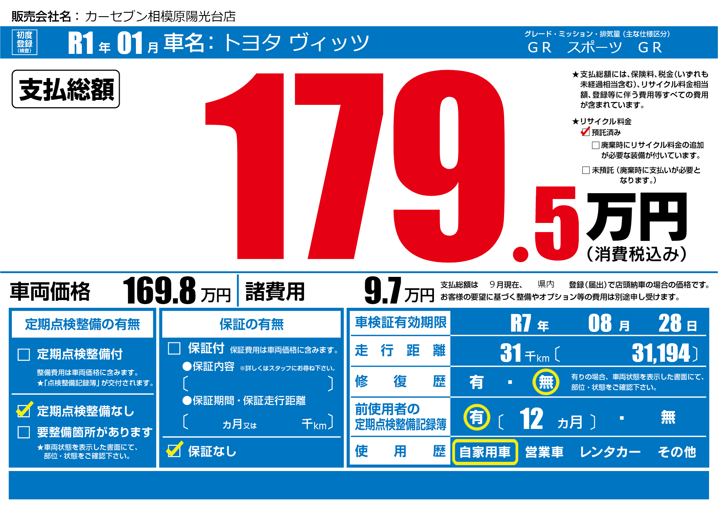 | 車検制限 | R7年 08月 28日 | ||