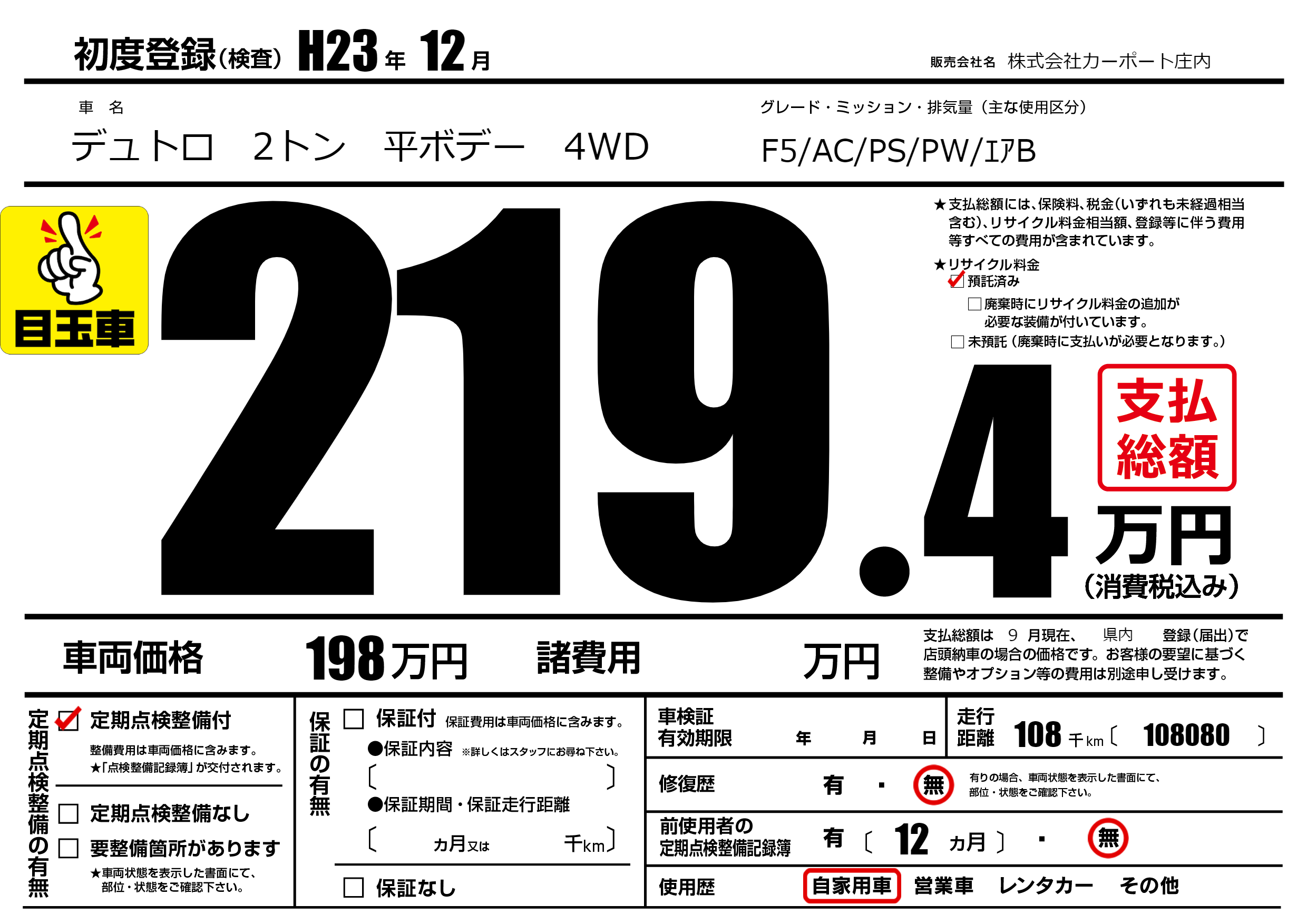 | 走行キロ | 10.8万km | 初年度登録 | H23年12月 |