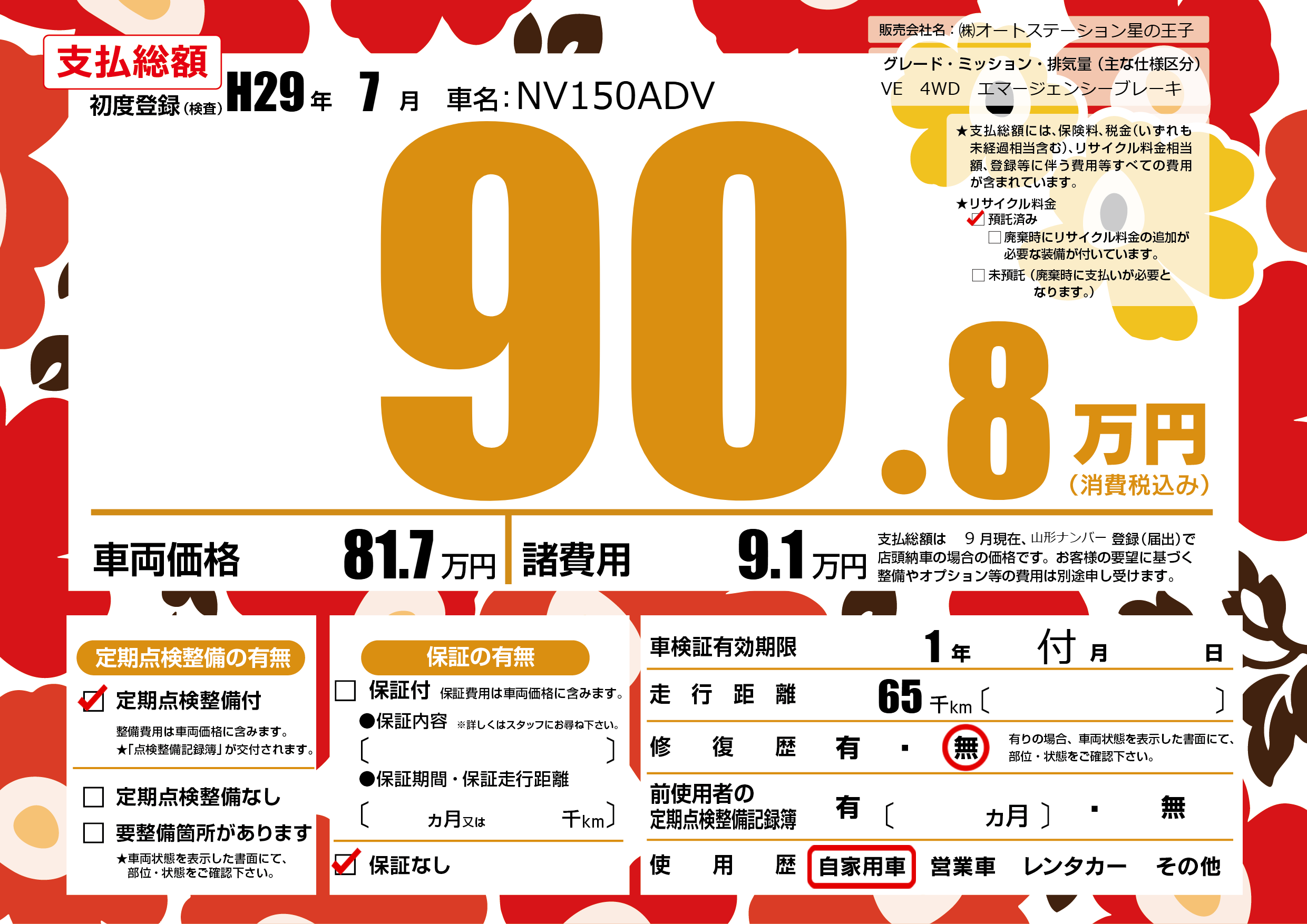 | 走行キロ | 6.5万km | 初年度登録 | H29年7月 |