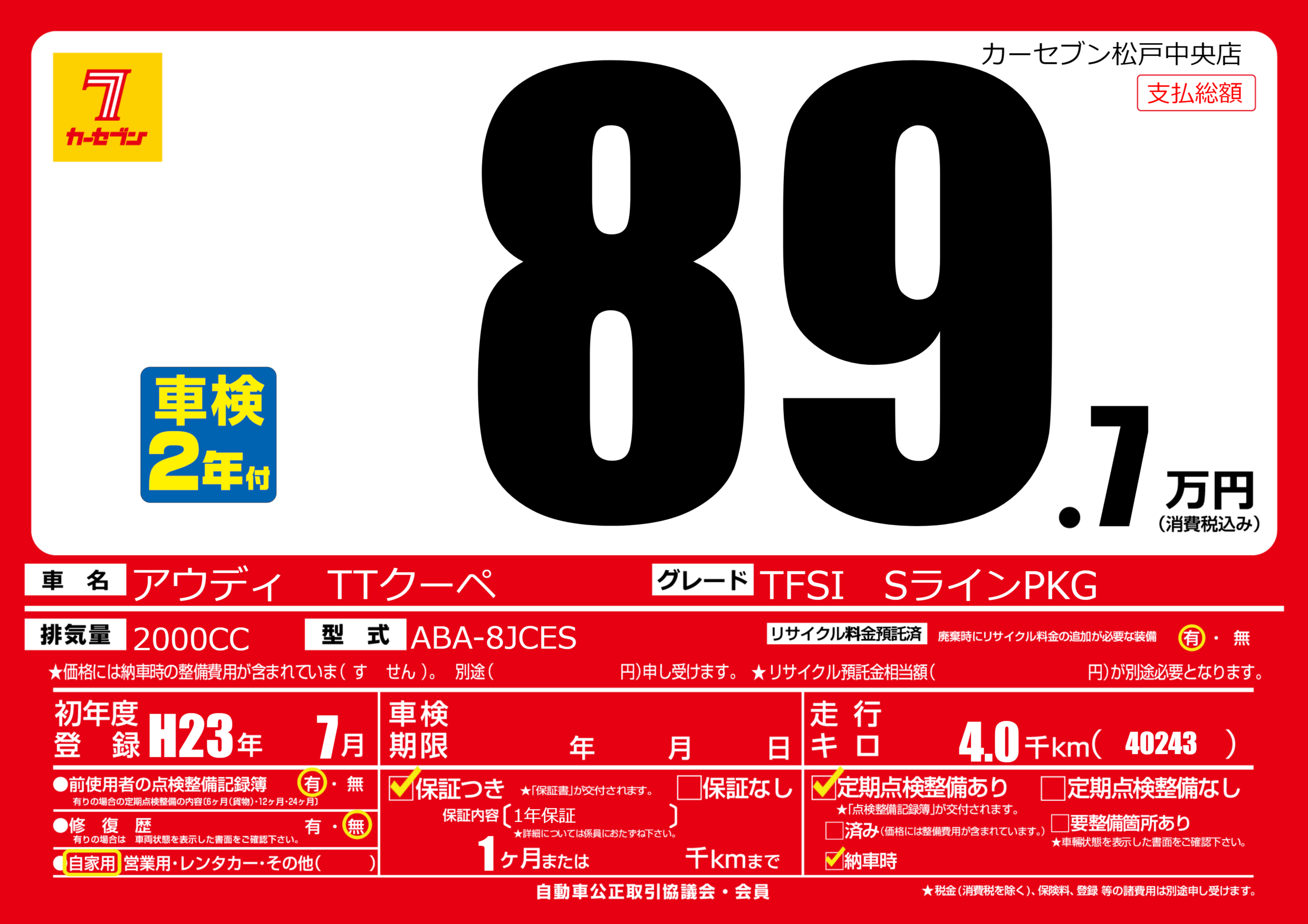 | 走行キロ | 0.4万km | 初年度登録 | H23年7月 |