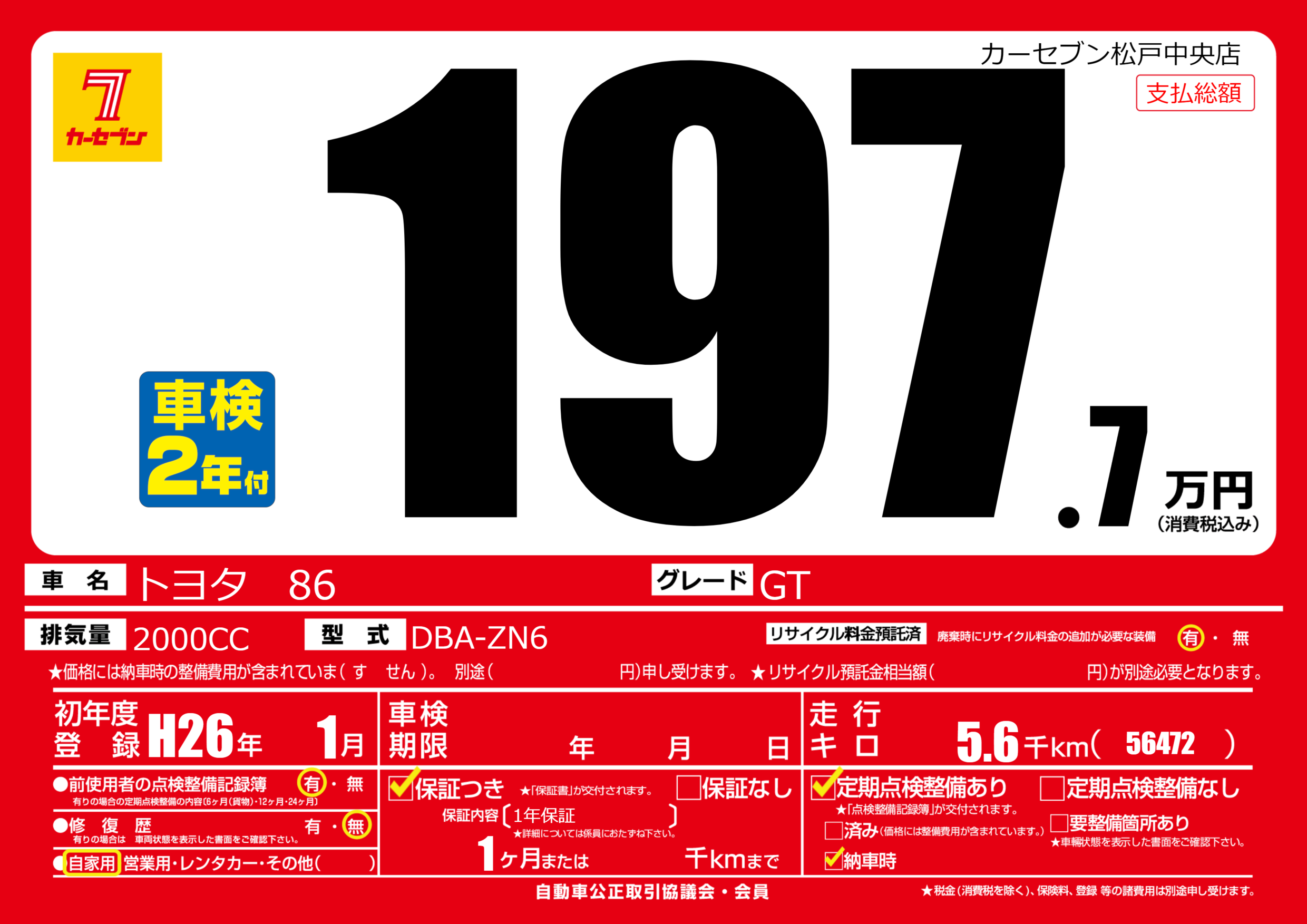 | 車名 | トヨタ 86 | グレード ミッション 排気量 |