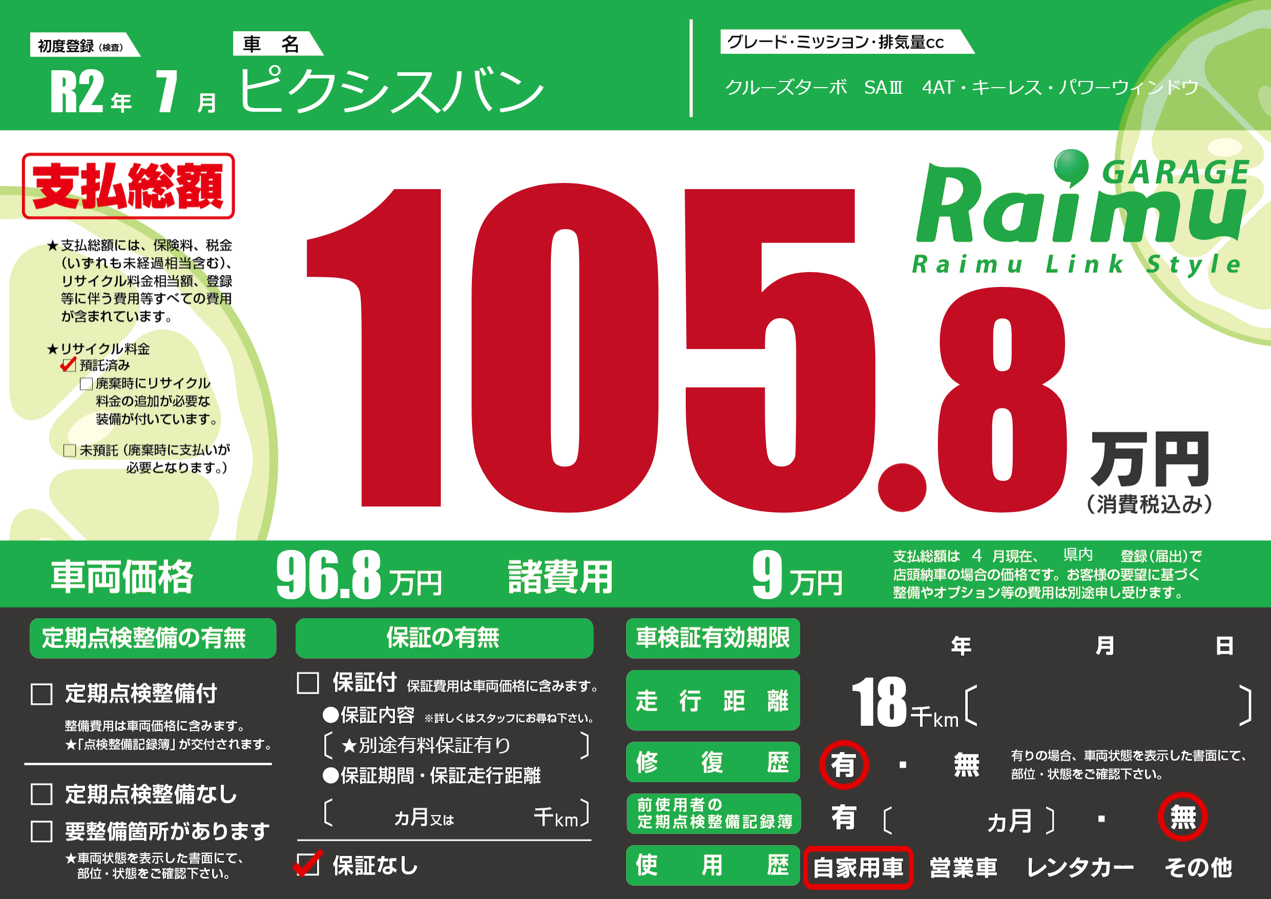 保証なし 保証内容(★別途有料保証有り) ---ヶ月または()千kmまで |