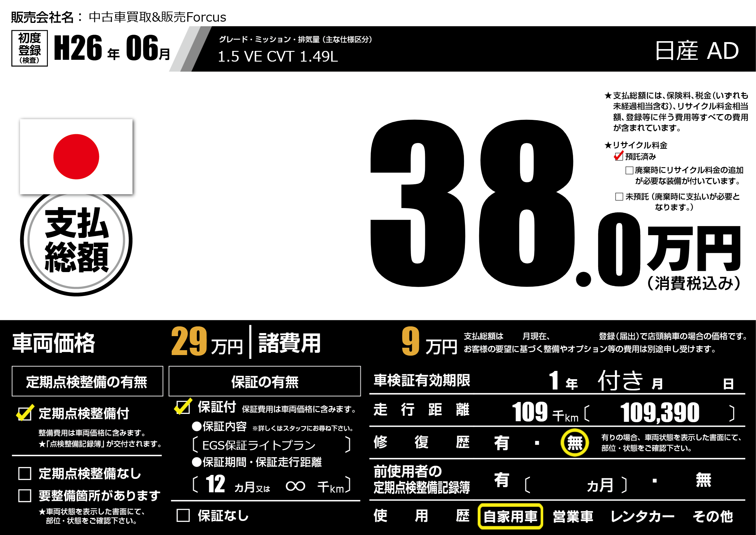 保証付き 保証内容(EGS保証ライトプラン) 12ヶ月または(∞)千kmまで |