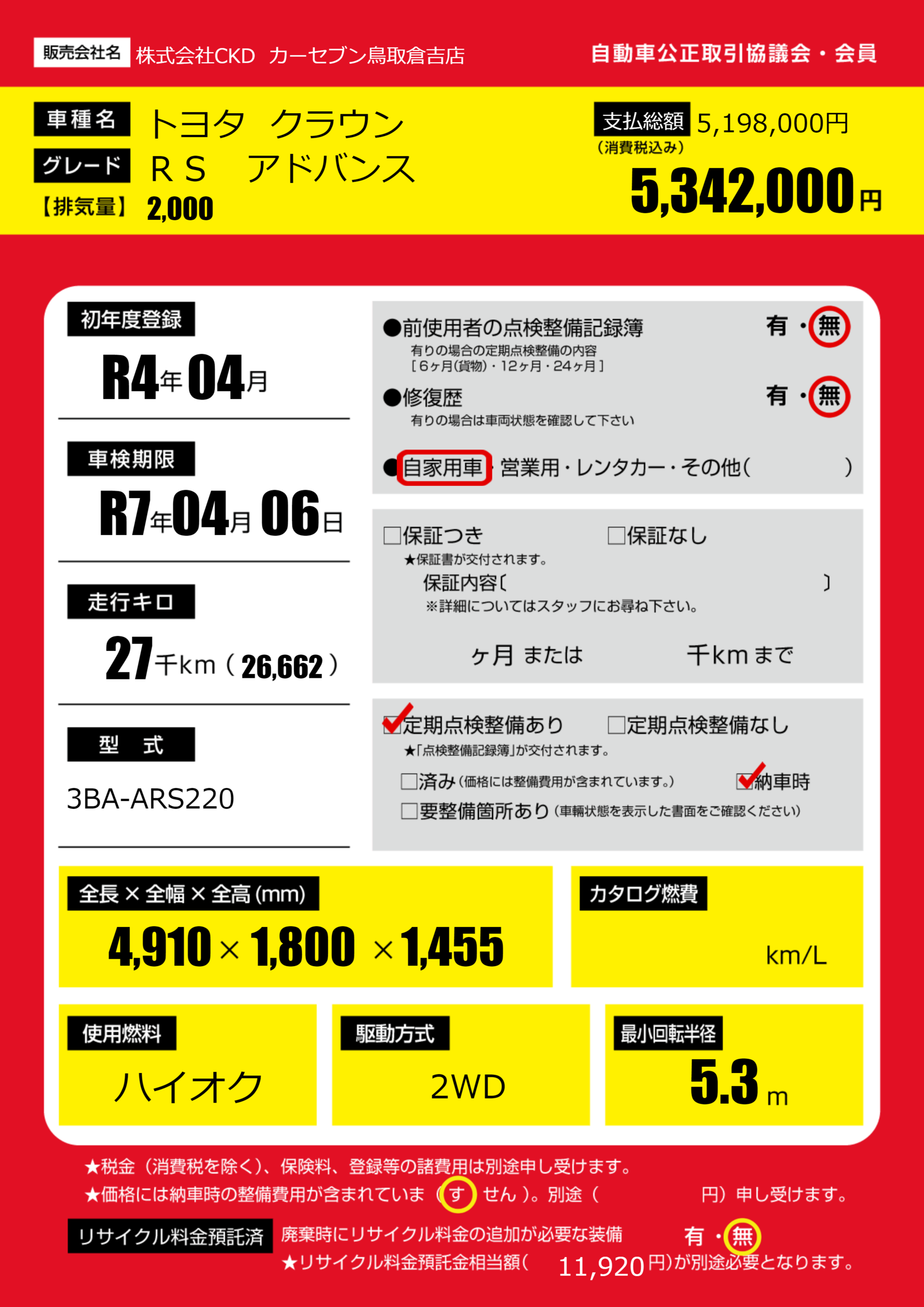 | 走行キロ | 2.7万km | 初年度登録 | R4年04月 |