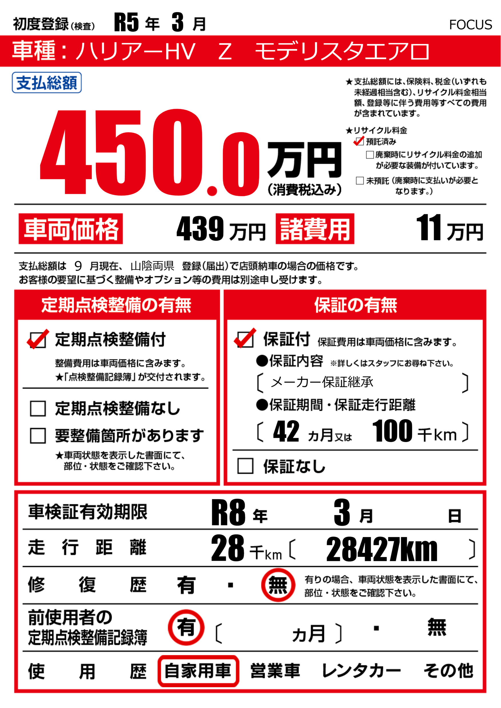 なし | 車検制限 | R8年3月---月 |