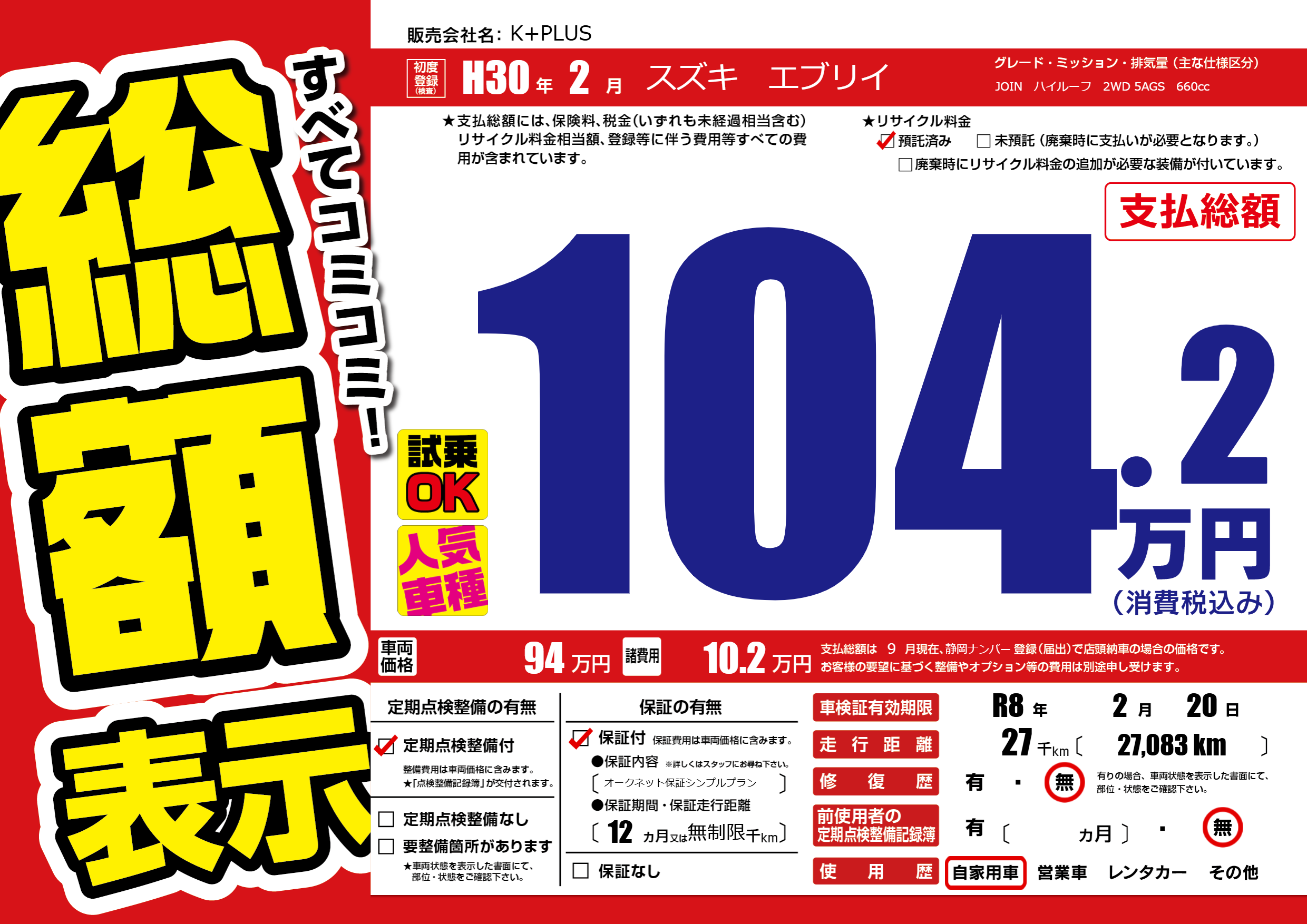 なし | 車検制限 | R8年2月20月 |