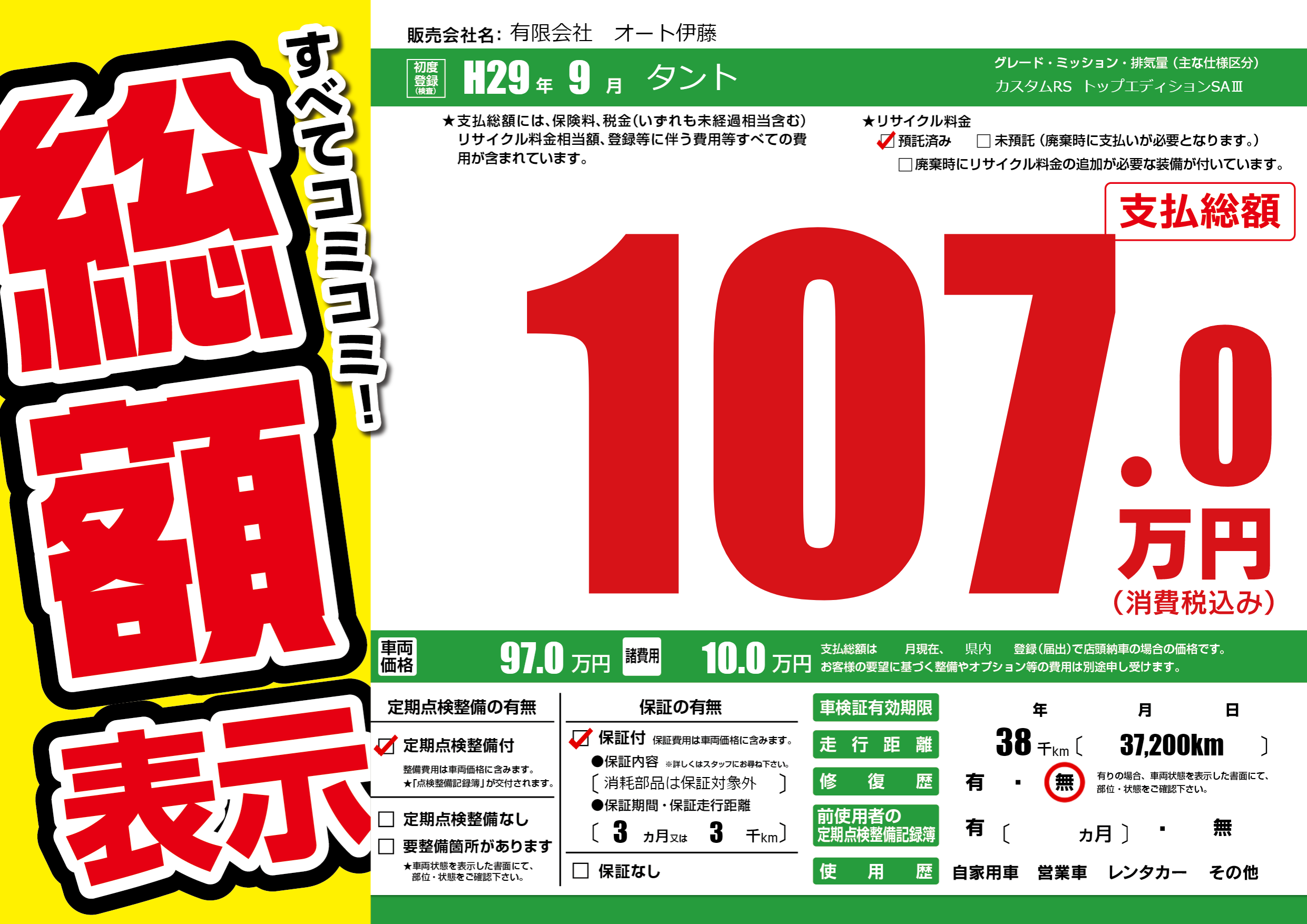 保証付き 保証内容(消耗部品は保証対象外) 3ヶ月または(3)千kmまで |