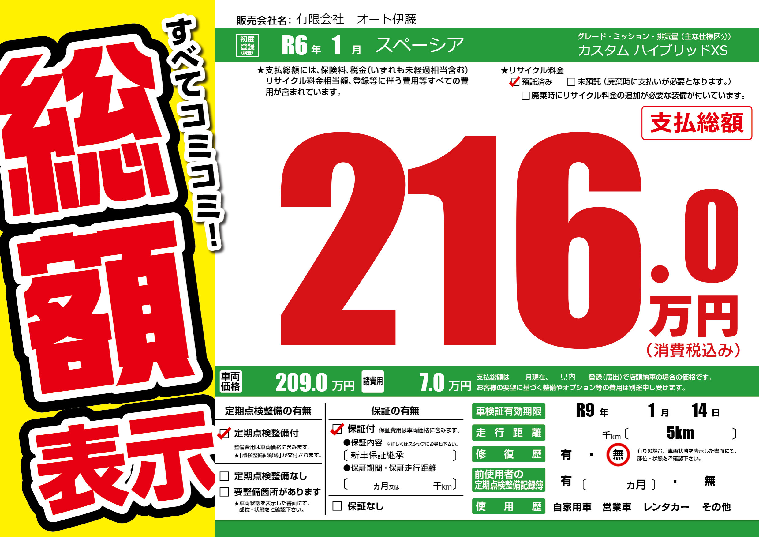 | 車名 | スペーシア | グレード ミッション 排気量 |