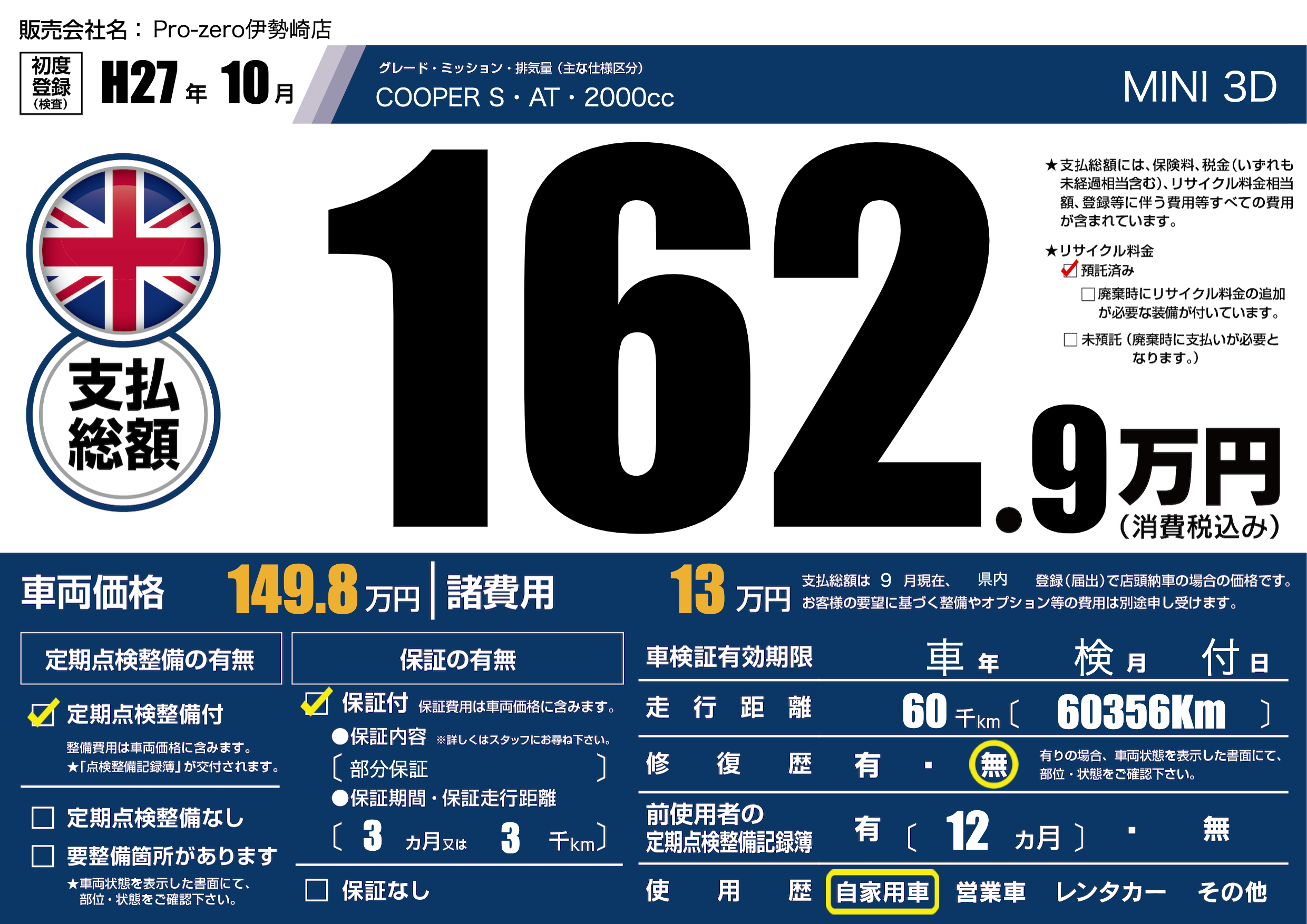 | 車名 | MINI 3D | グレード ミッション 排気量 |