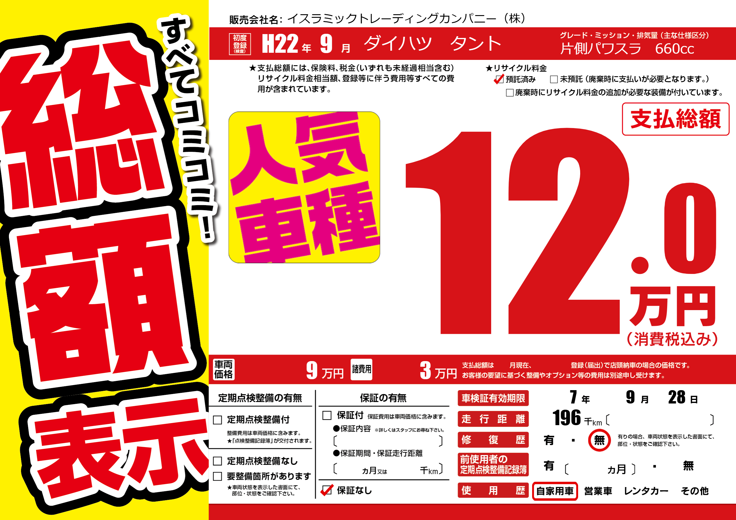 | 走行キロ | 19.6万km | 初年度登録 | H22年9月 |