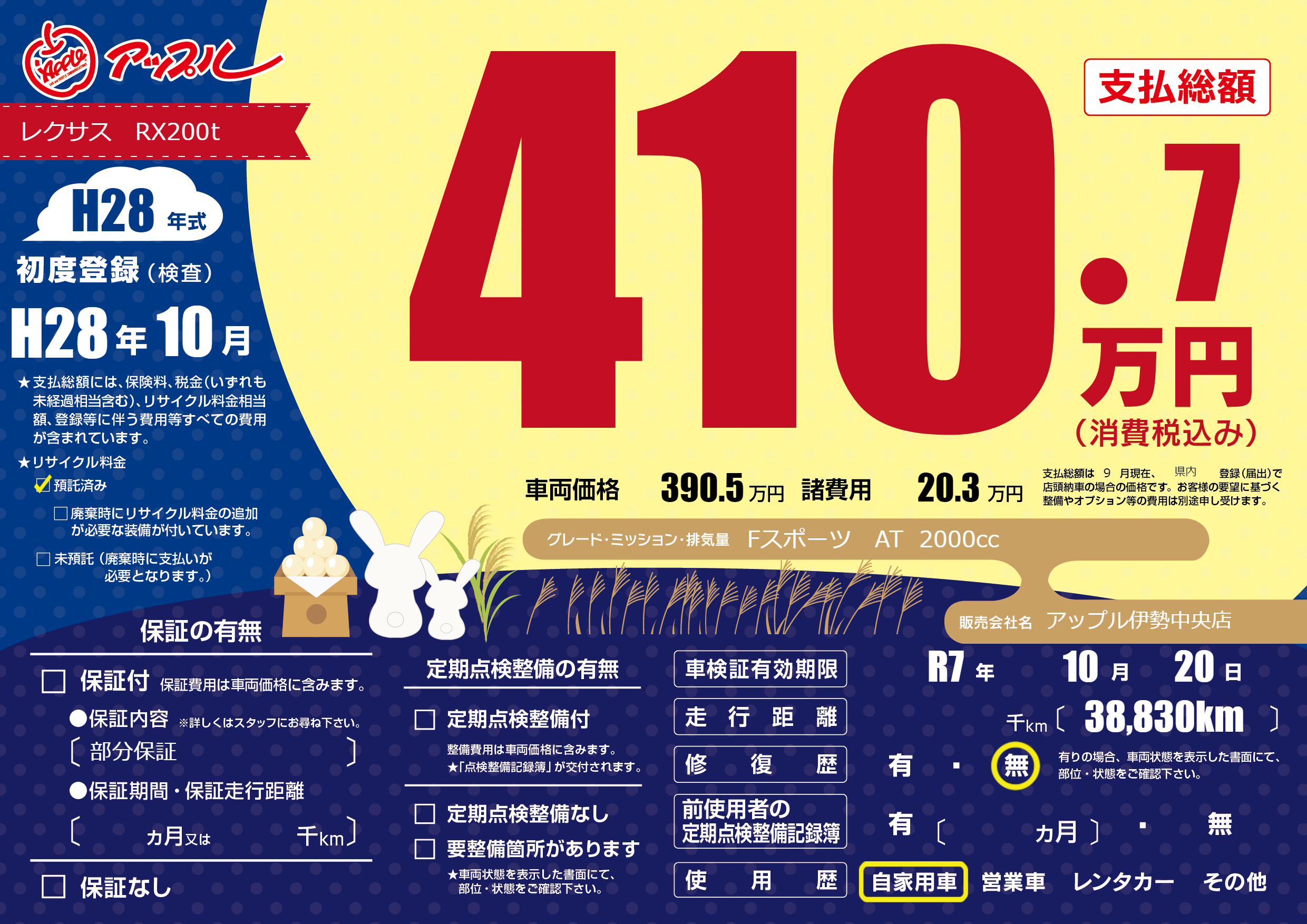 | 車名 | レクサス RX200t | グレード ミッション 排気量 |