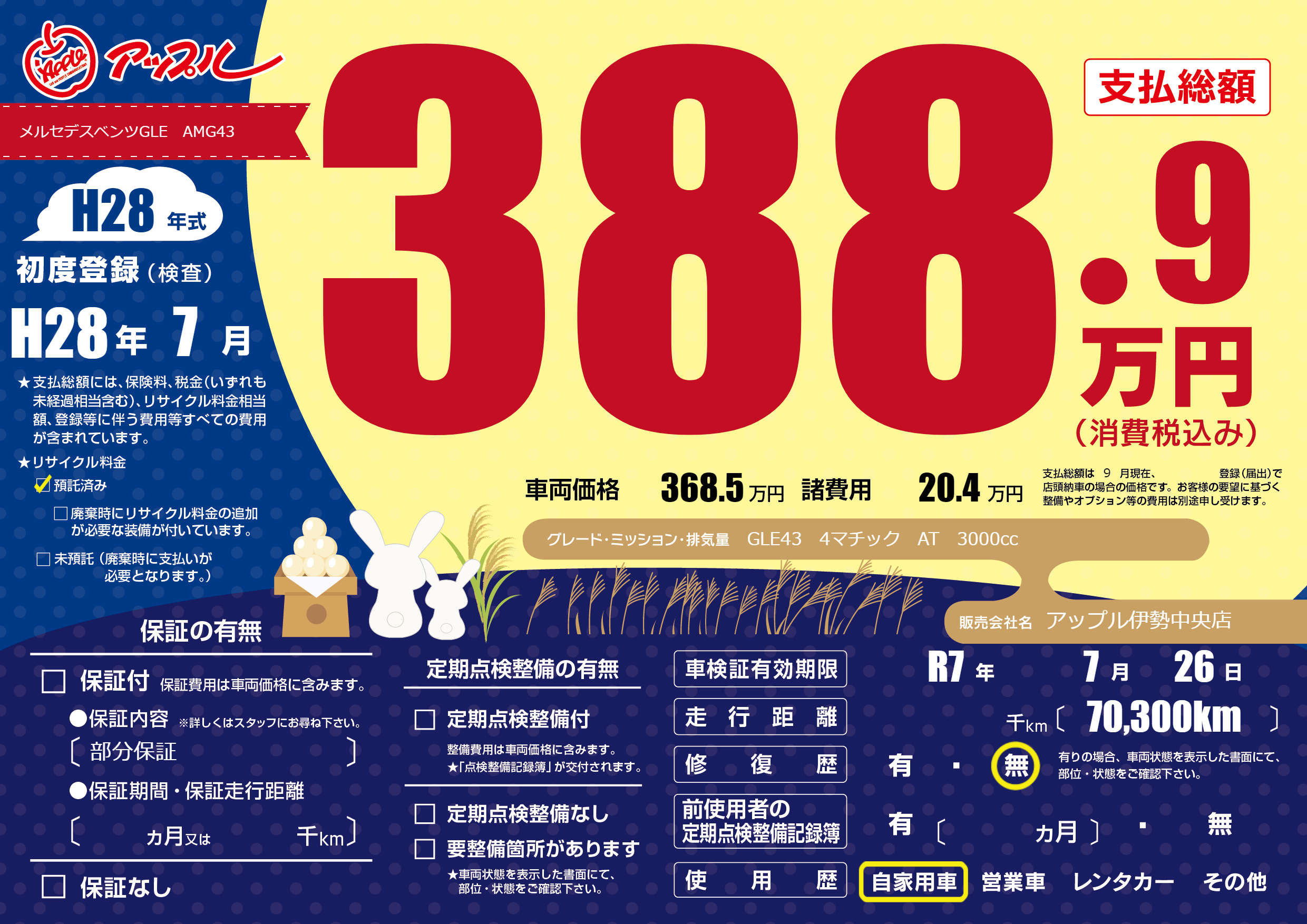 | 車名 | メルセデスベンツGLE AMG43 | グレード ミッション 排気量 |