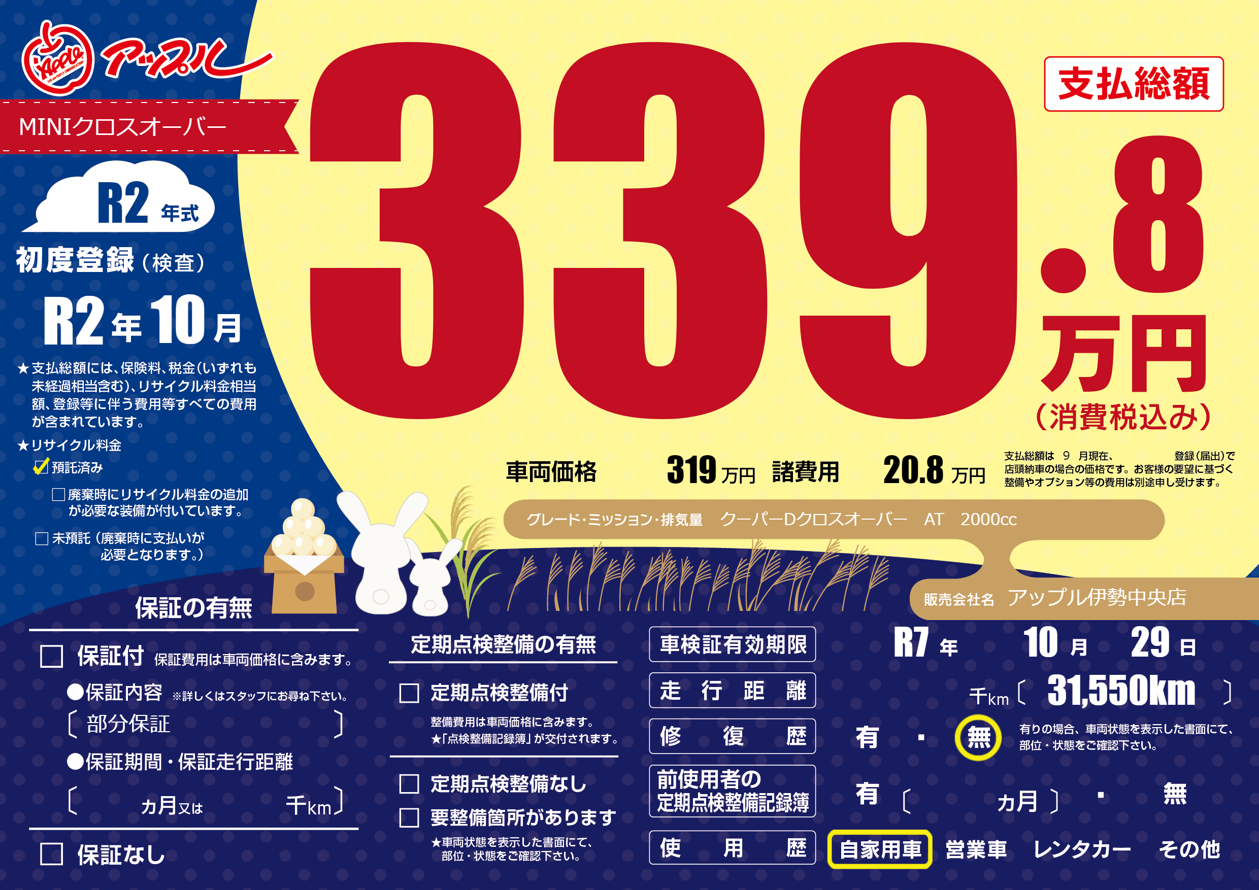 | 車名 | MINIクロスオーバー | グレード ミッション 排気量 |