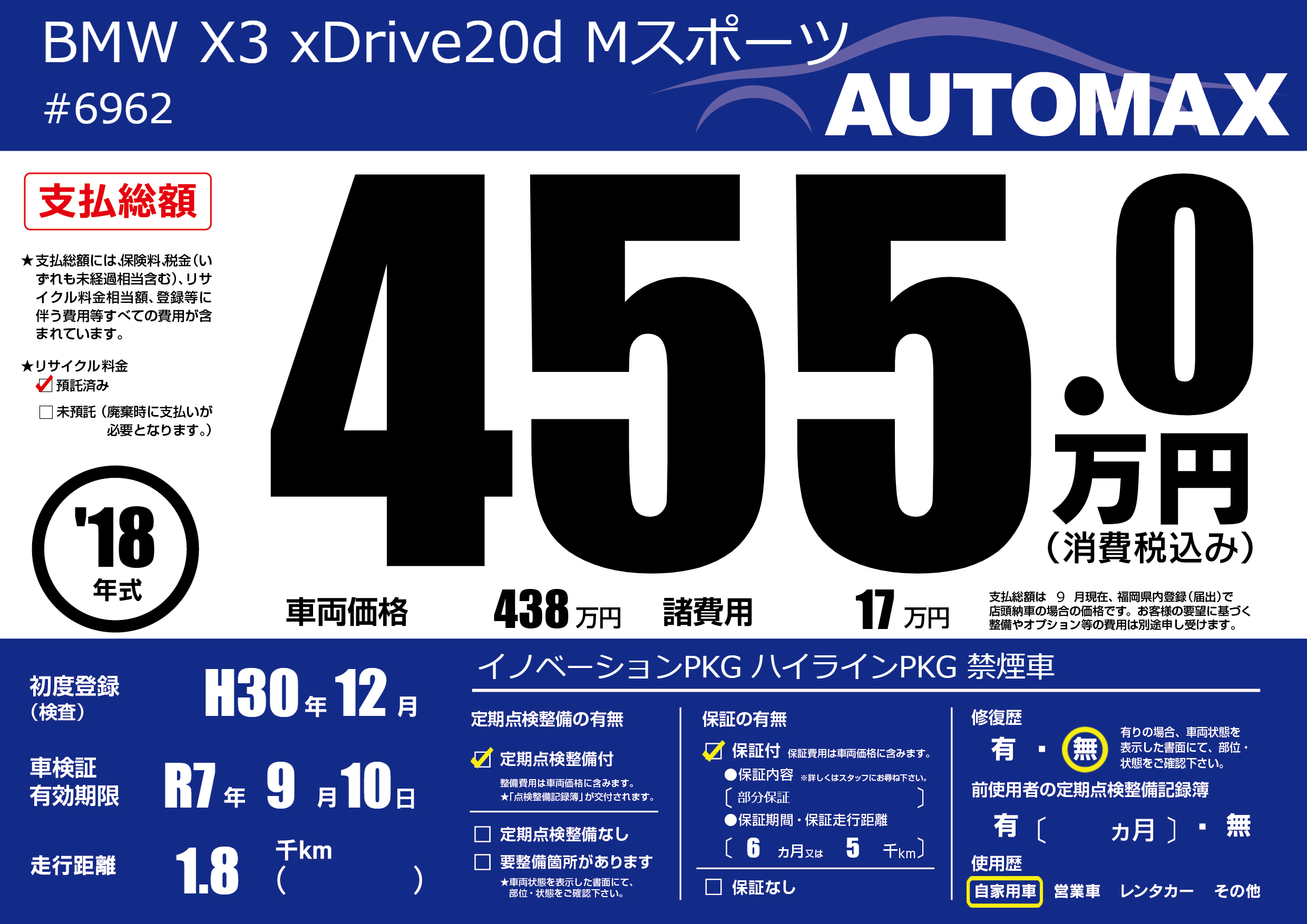 | 車名 | BMW X3 xDrive20d Mスポーツ | グレード ミッション 排気量 |