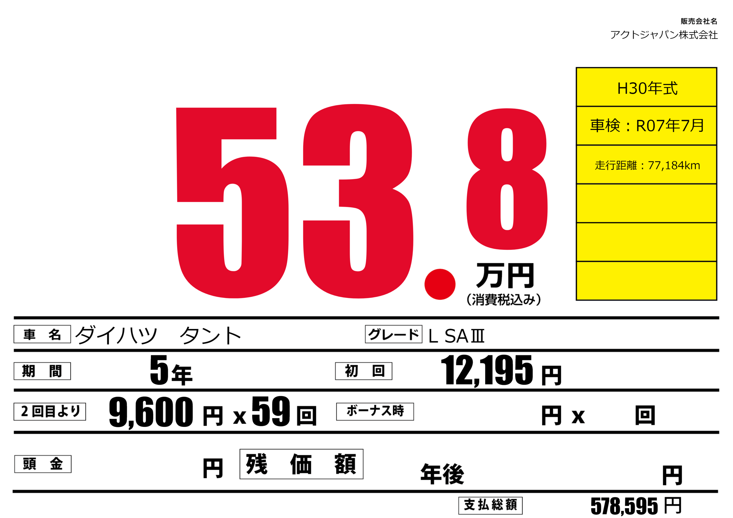 | 車名 | ダイハツ タント | グレード ミッション 排気量 |