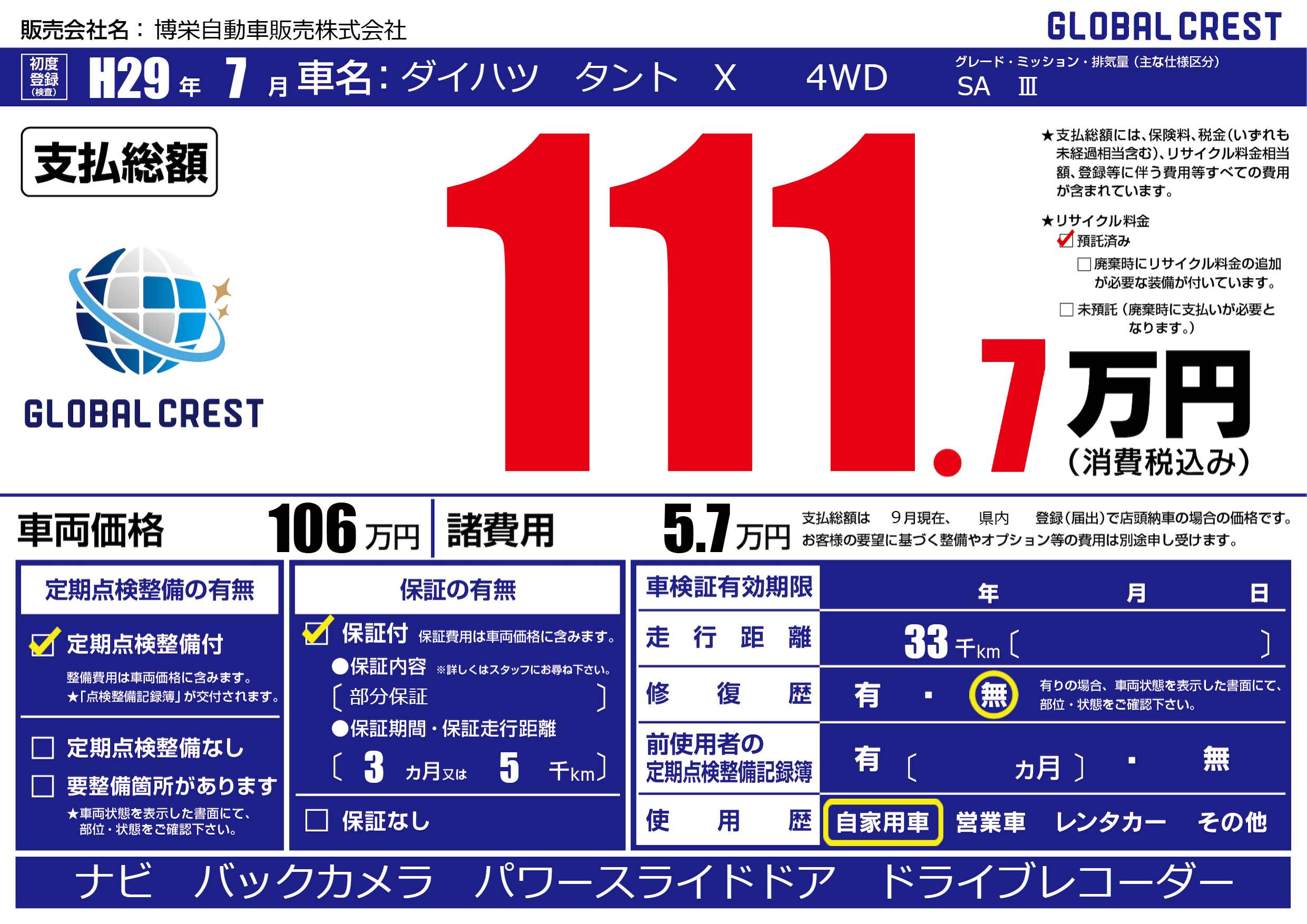 | 車名 | ダイハツ タント X 4WD | グレード ミッション 排気量 |