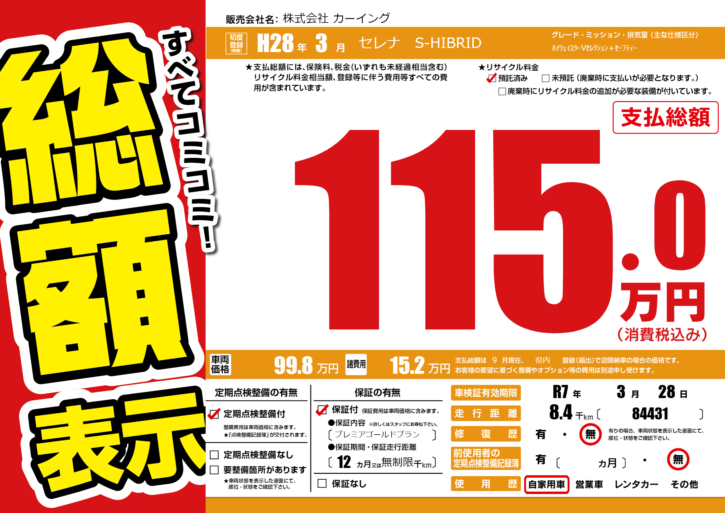 | 車名 | セレナ S-HIBRID | グレード ミッション 排気量 |