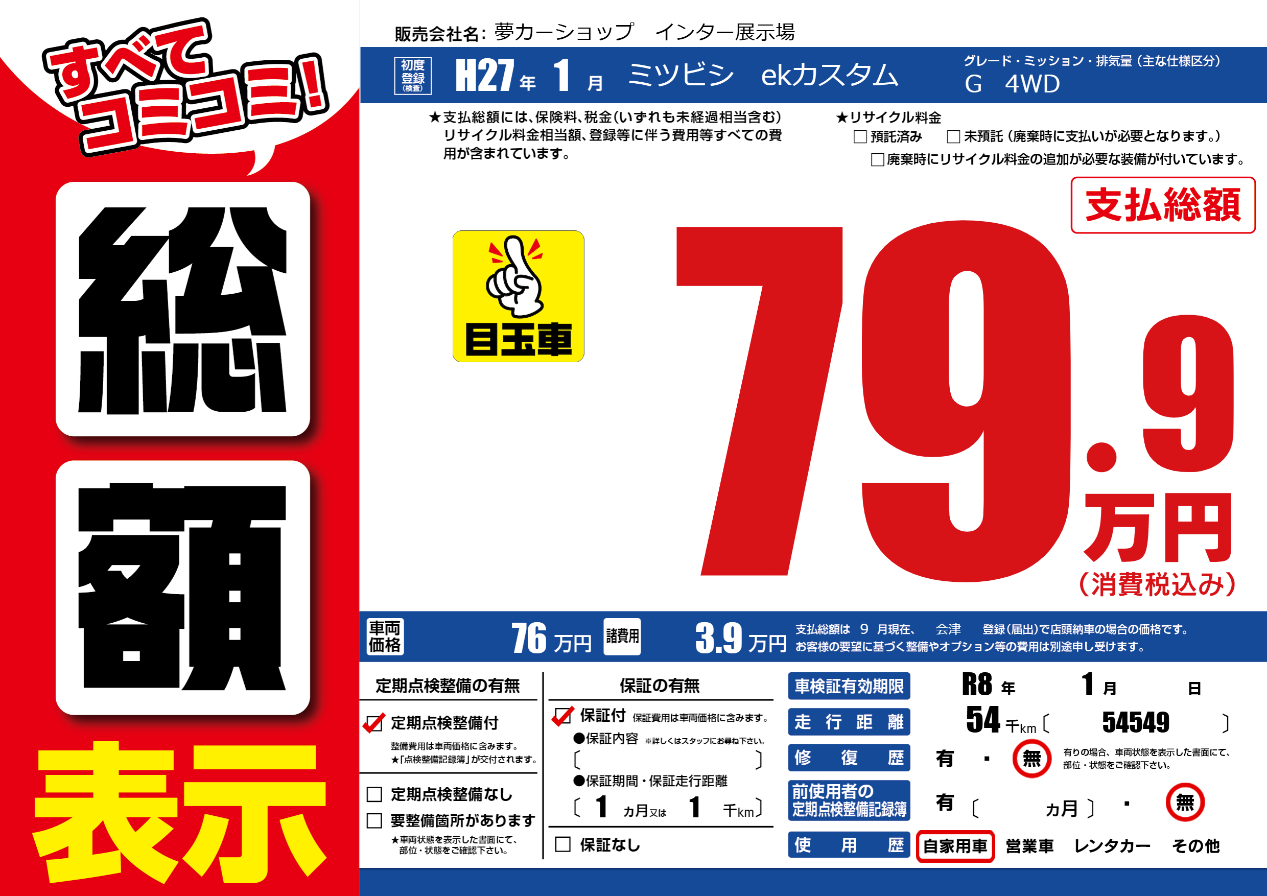 | 車検制限 | R8年 1月 - 日 | ||