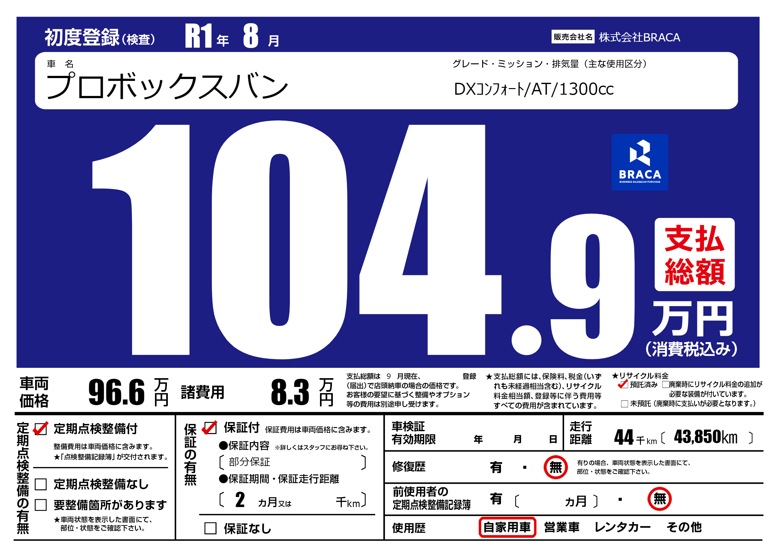 | 車名 | プロボックスバン | グレード ミッション 排気量 |