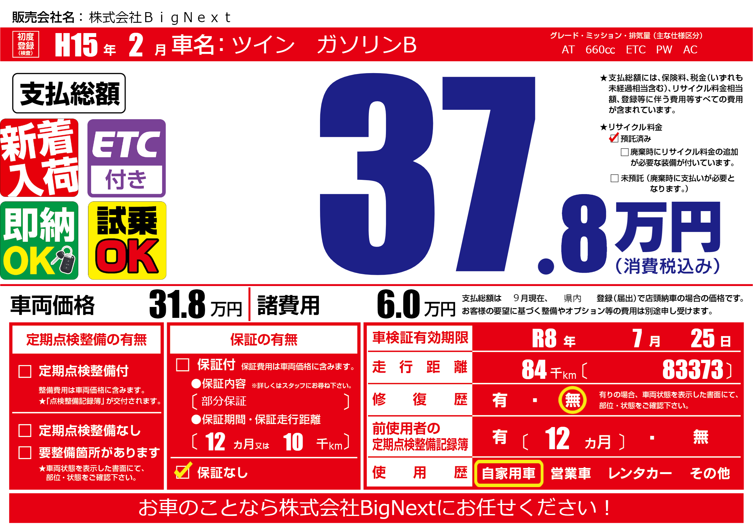 | 車名 | ツイン ガソリンB | グレード ミッション 排気量 |