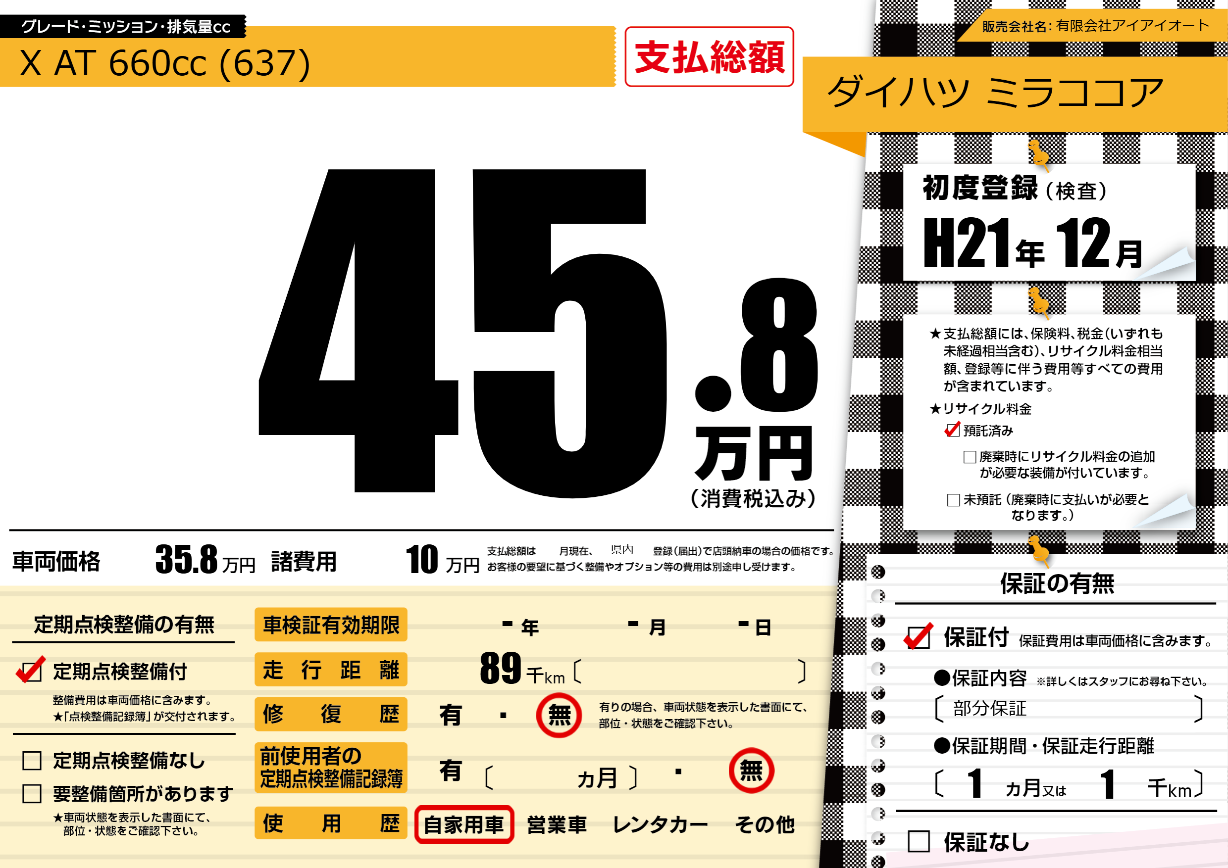 | 車名 | ダイハツ ミラココア | グレード ミッション 排気量 |