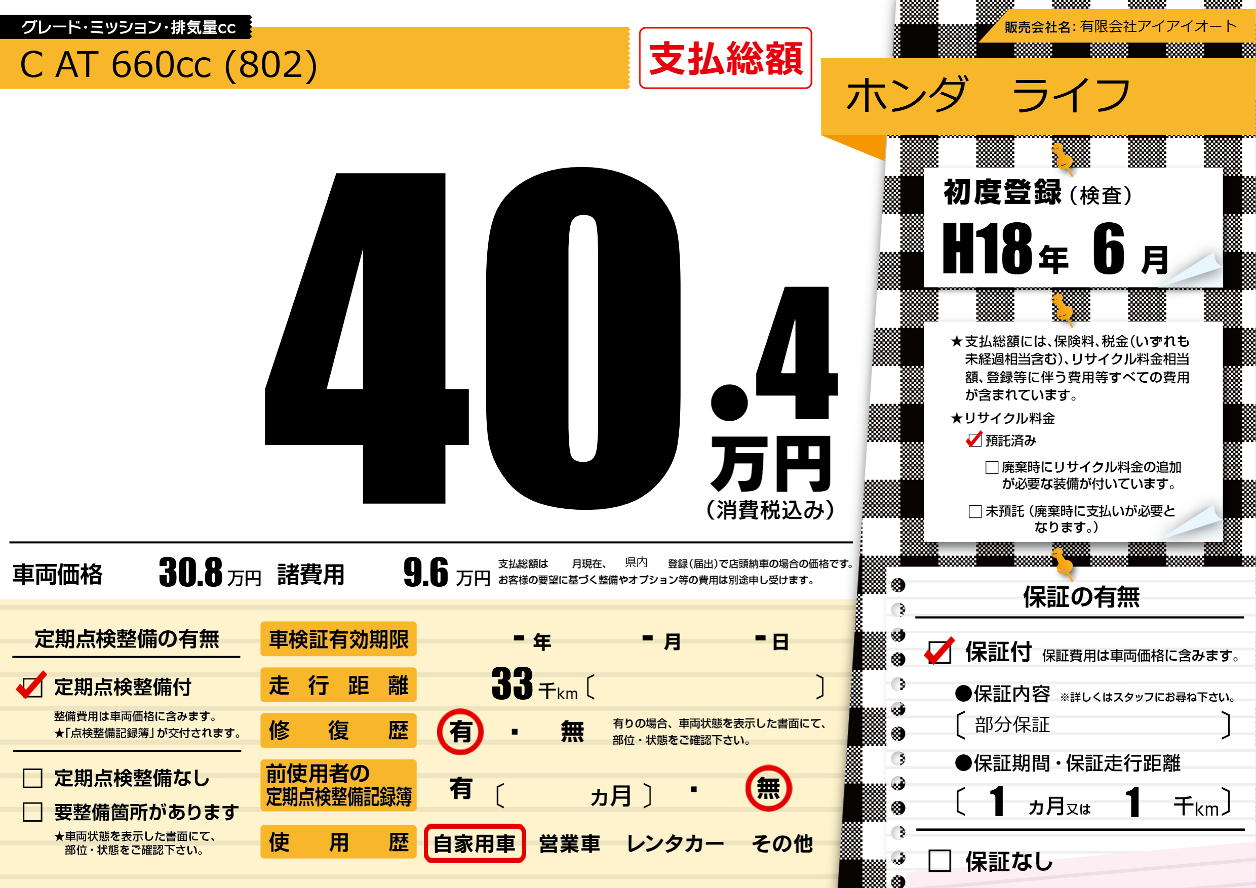 | 車名 | ホンダ ライフ | グレード ミッション 排気量 |