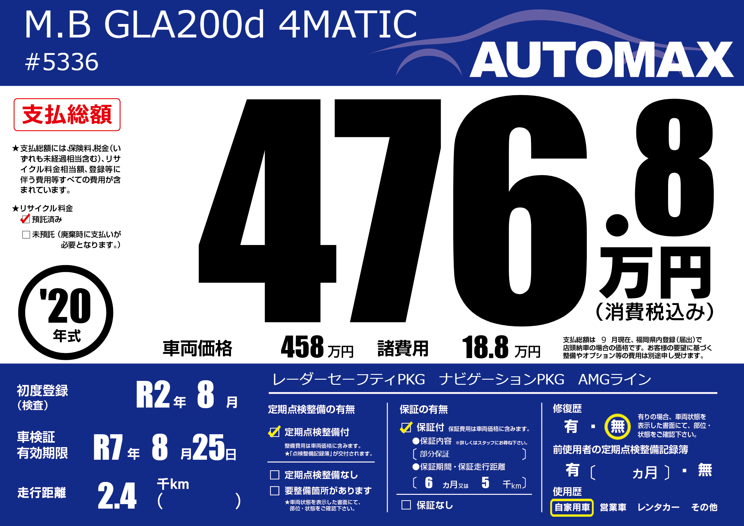 | 車名 | M.B GLA200d 4MATIC | グレード ミッション 排気量 |