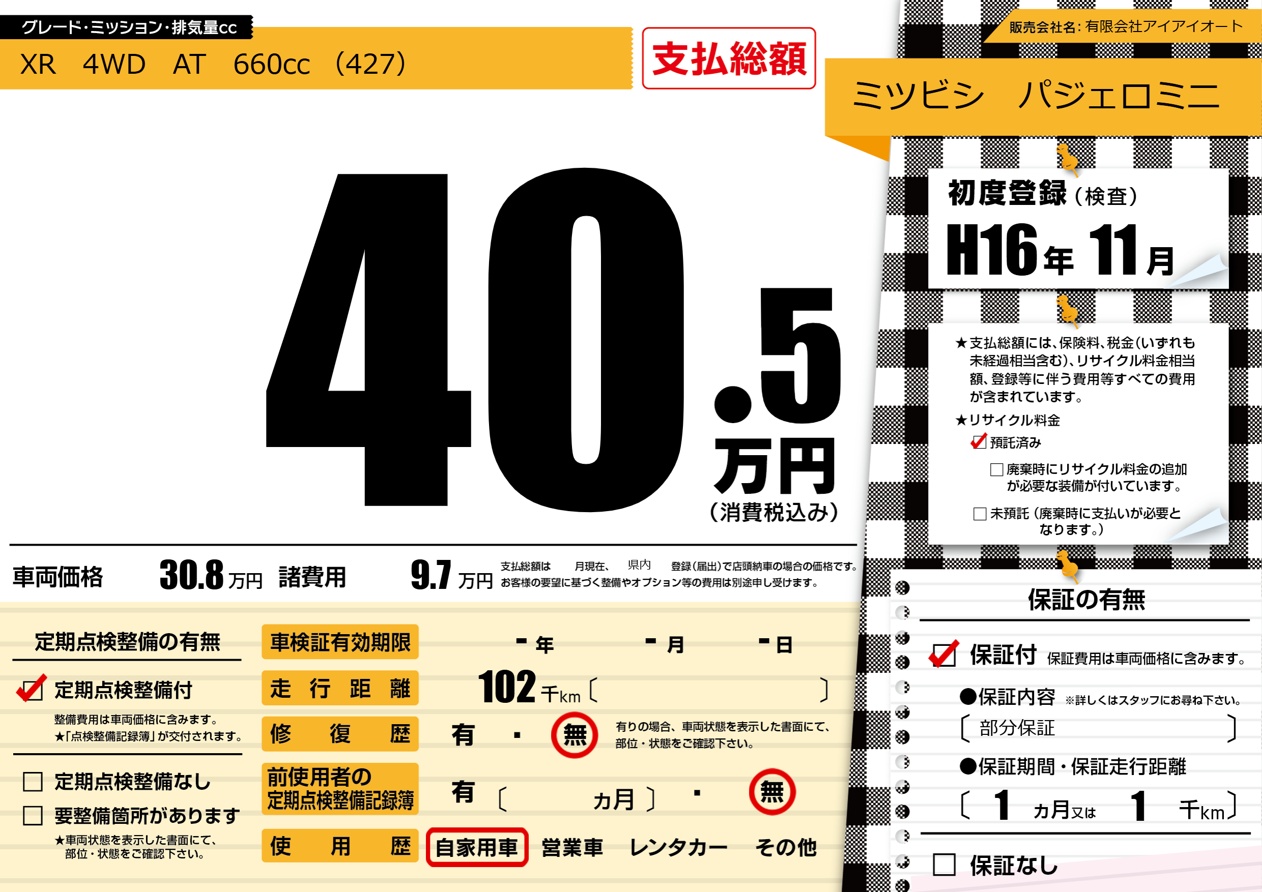 | 車名 | ミツビシ パジェロミニ | グレード ミッション 排気量 |