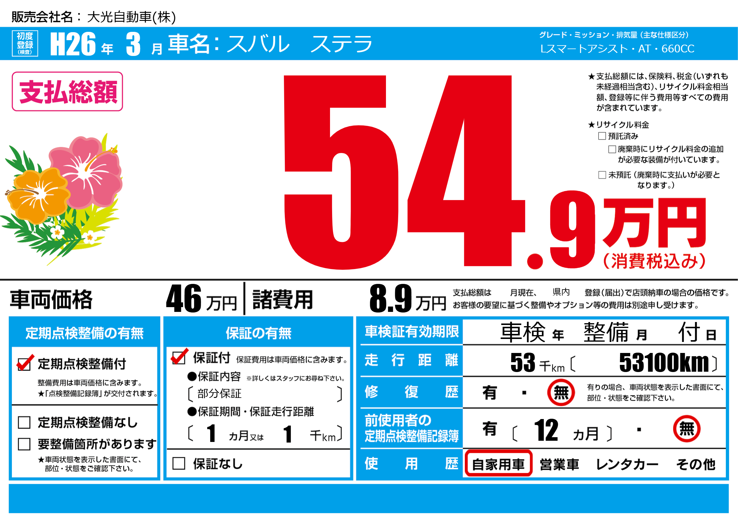 | 車名 | スバル ステラ | グレード ミッション 排気量 |