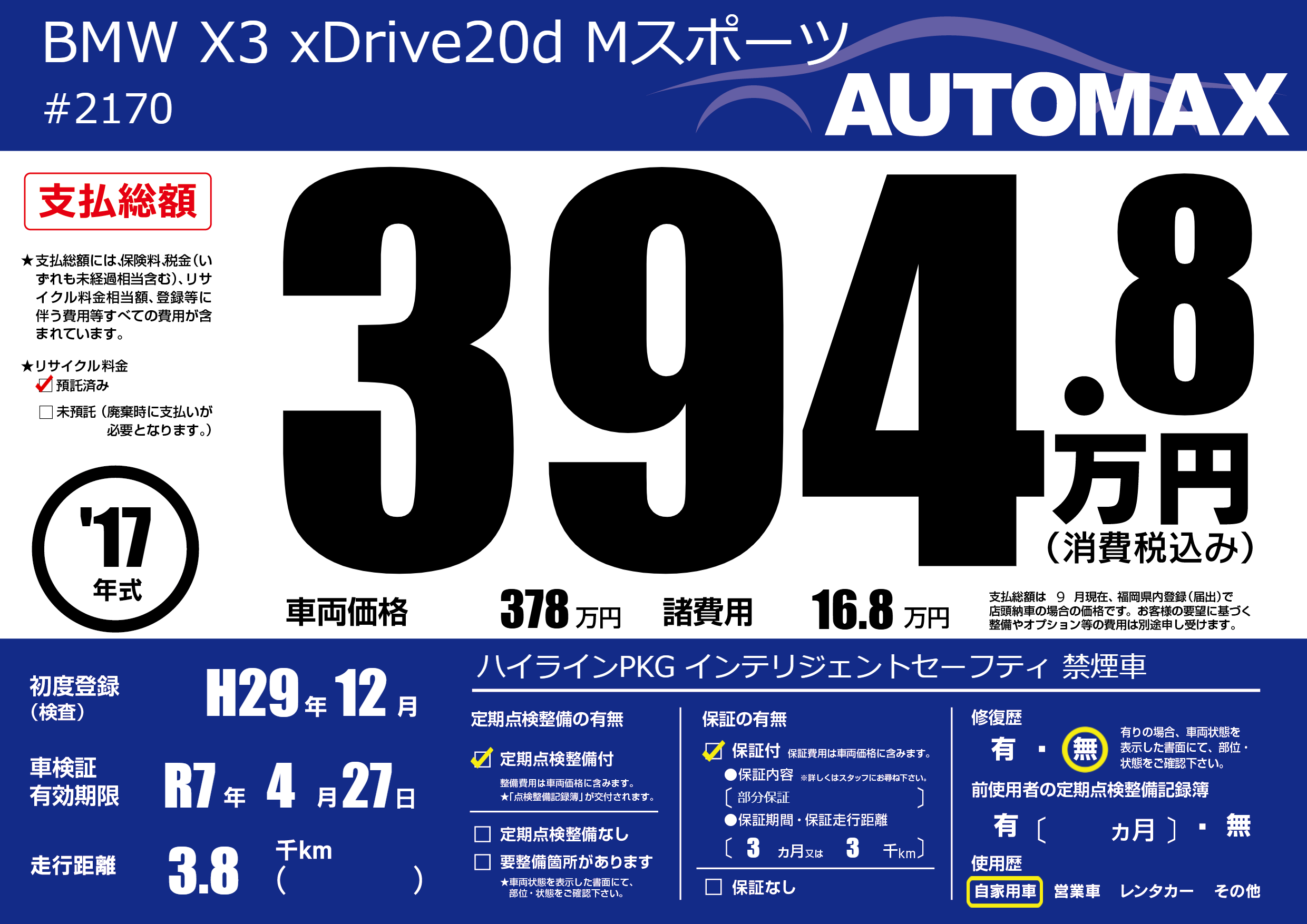 | 車名 | BMW X3 xDrive20d Mスポーツ | グレード ミッション 排気量 |