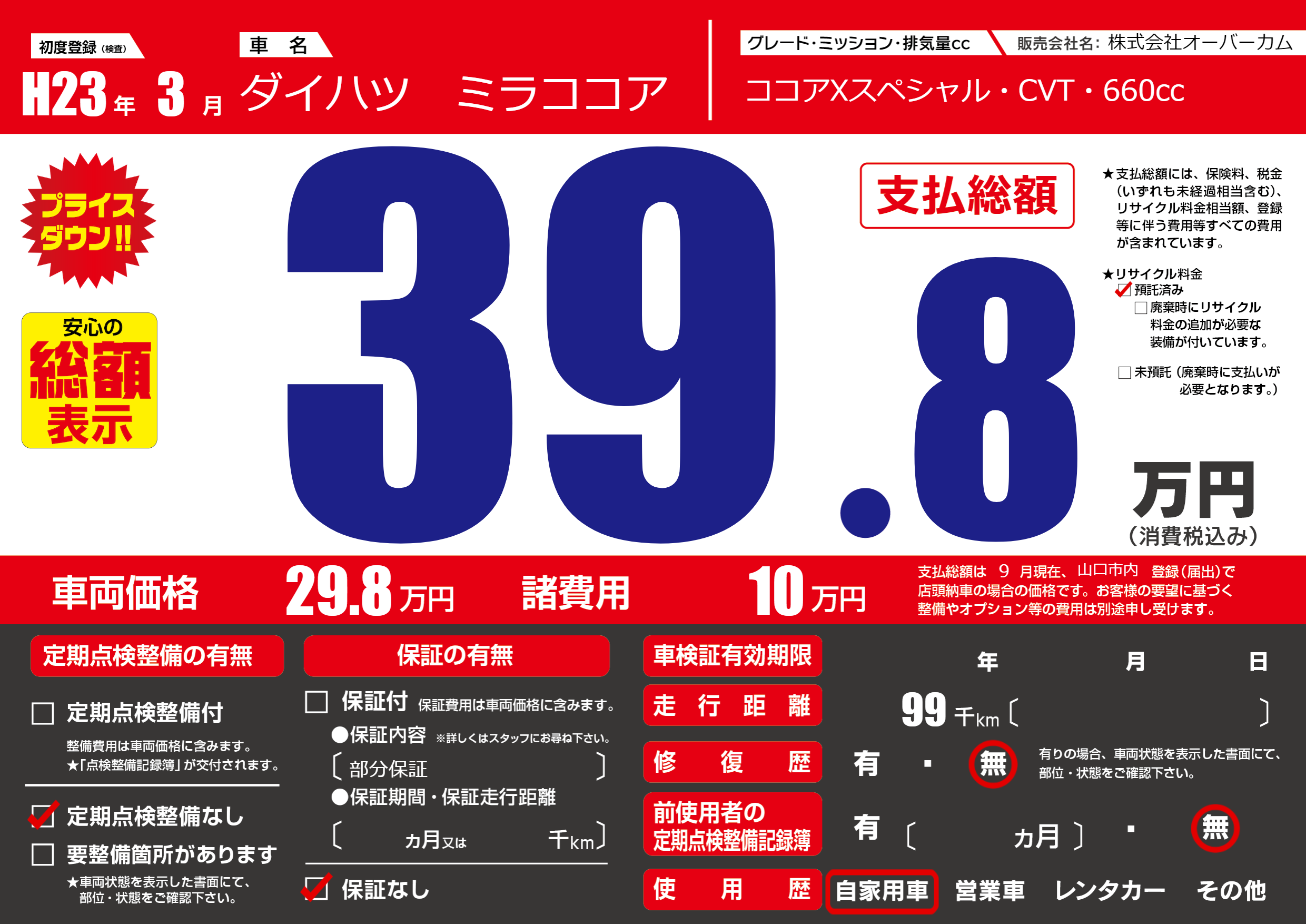 | 走行キロ | 9.9万km | 初年度登録 | H23年3月 |
