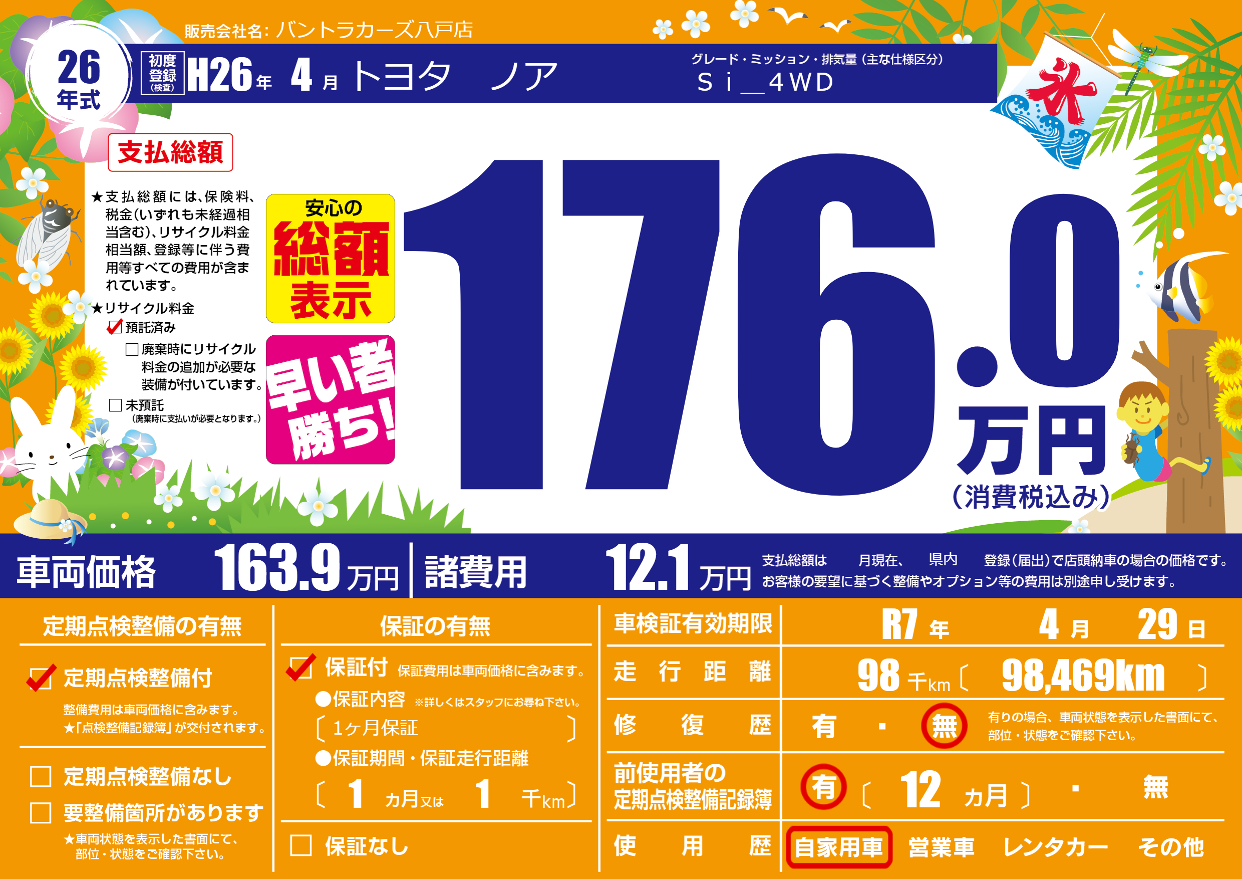 | 走行キロ | 9.8万km | 初年度登録 | H26年4月 |