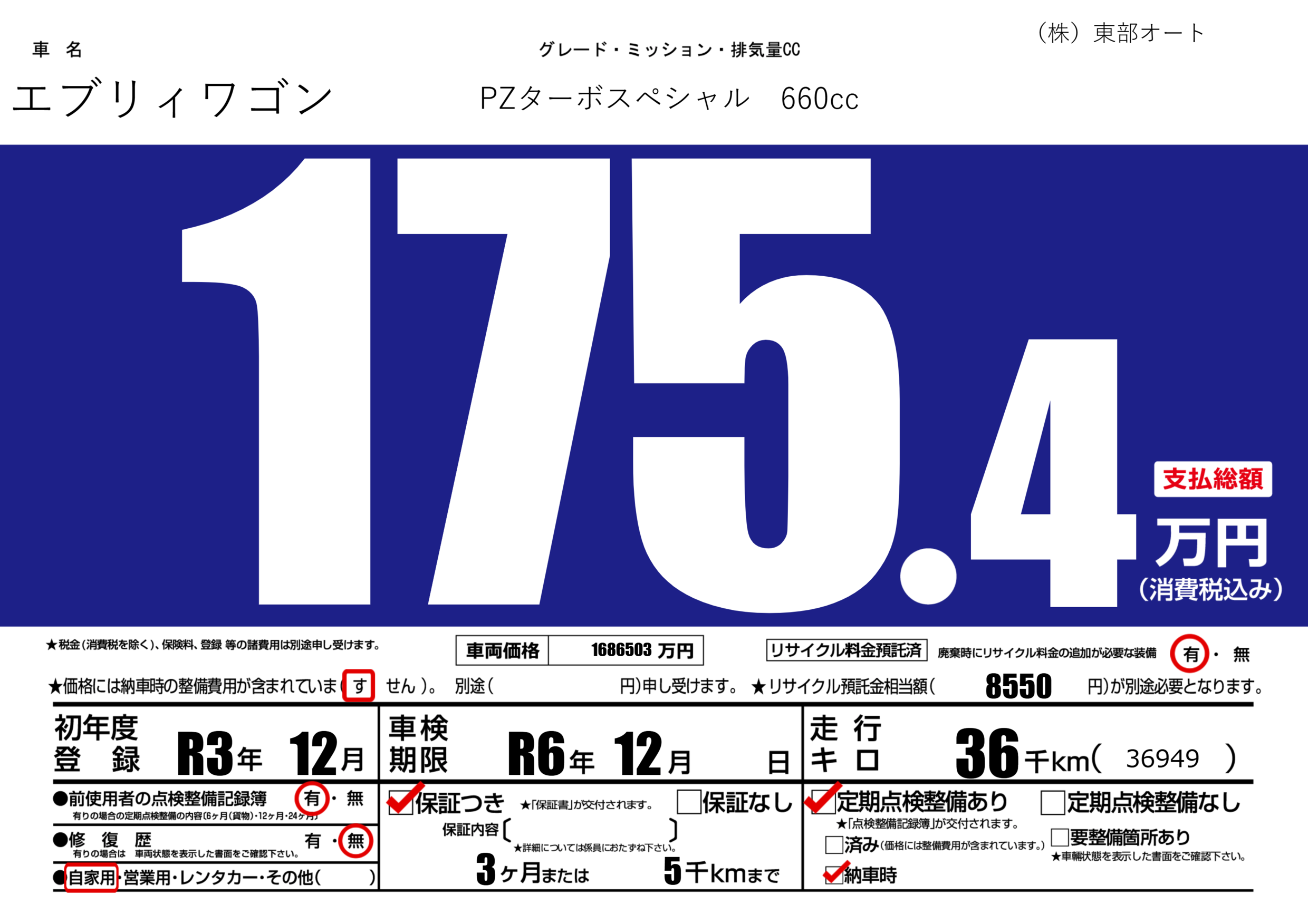 | 車名 | エブリィワゴン | グレード ミッション 排気量 |