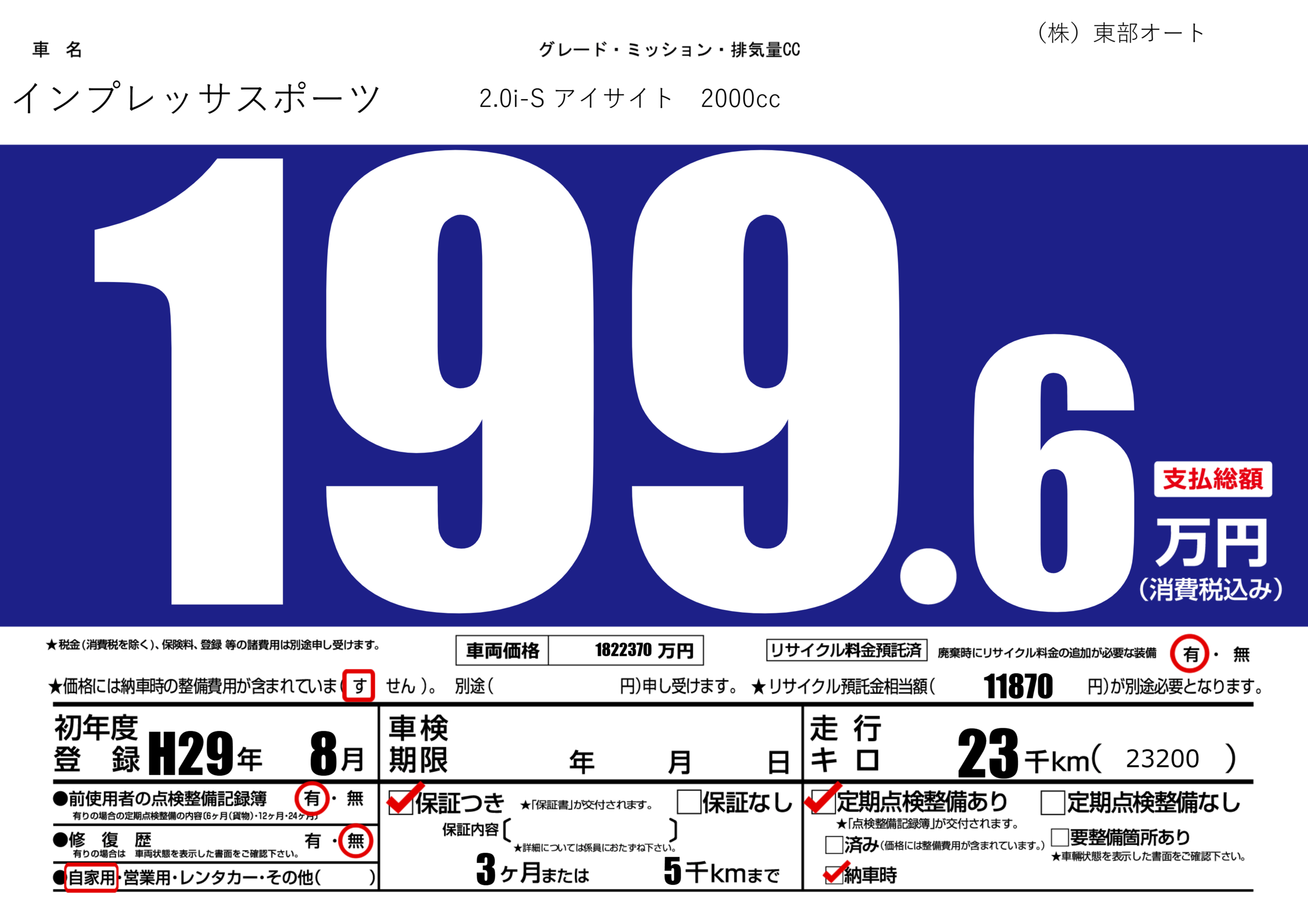 | 車名 | インプレッサスポーツ | グレード ミッション 排気量 |