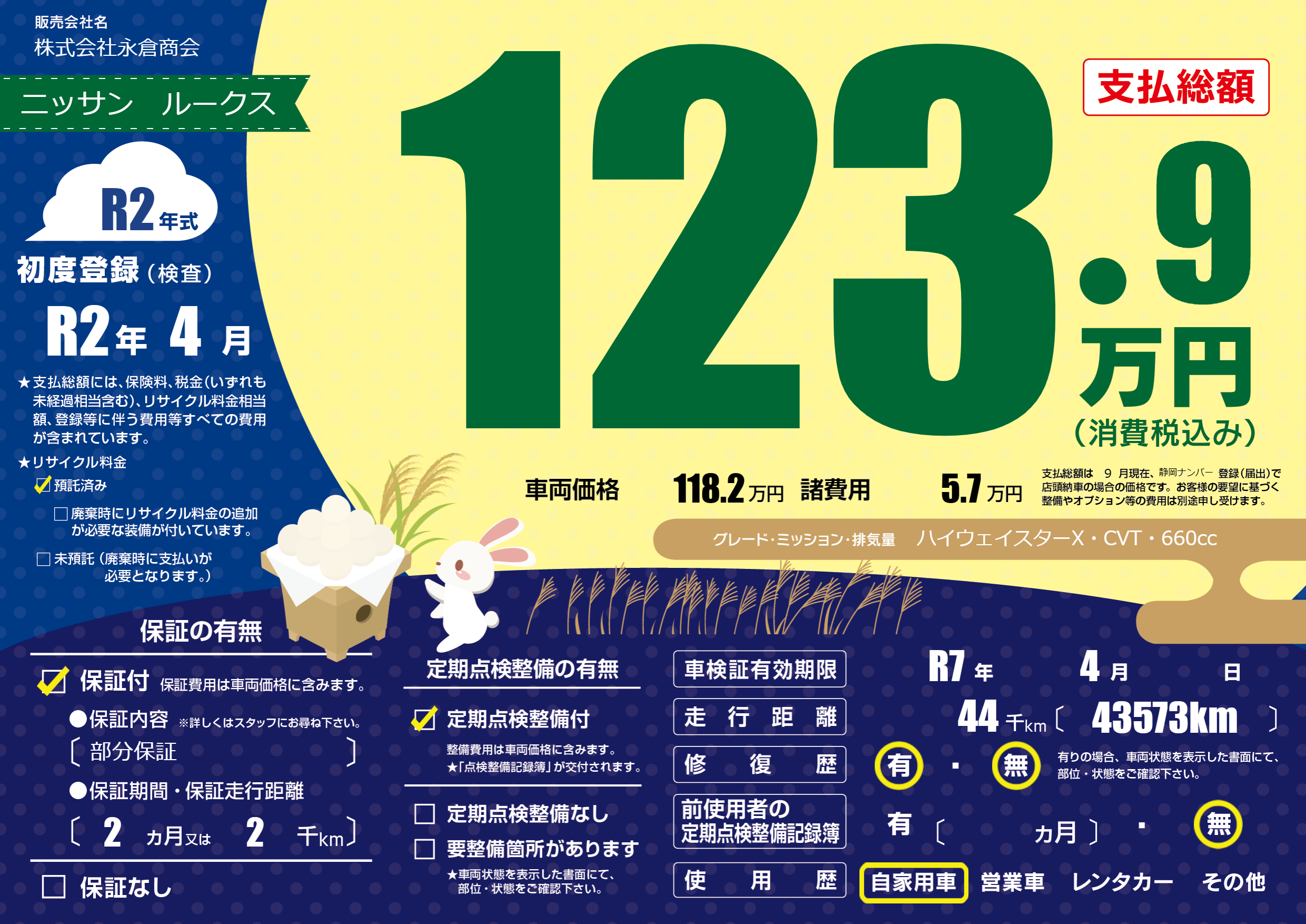 | 車名 | ニッサン ルークス | グレード ミッション 排気量 |