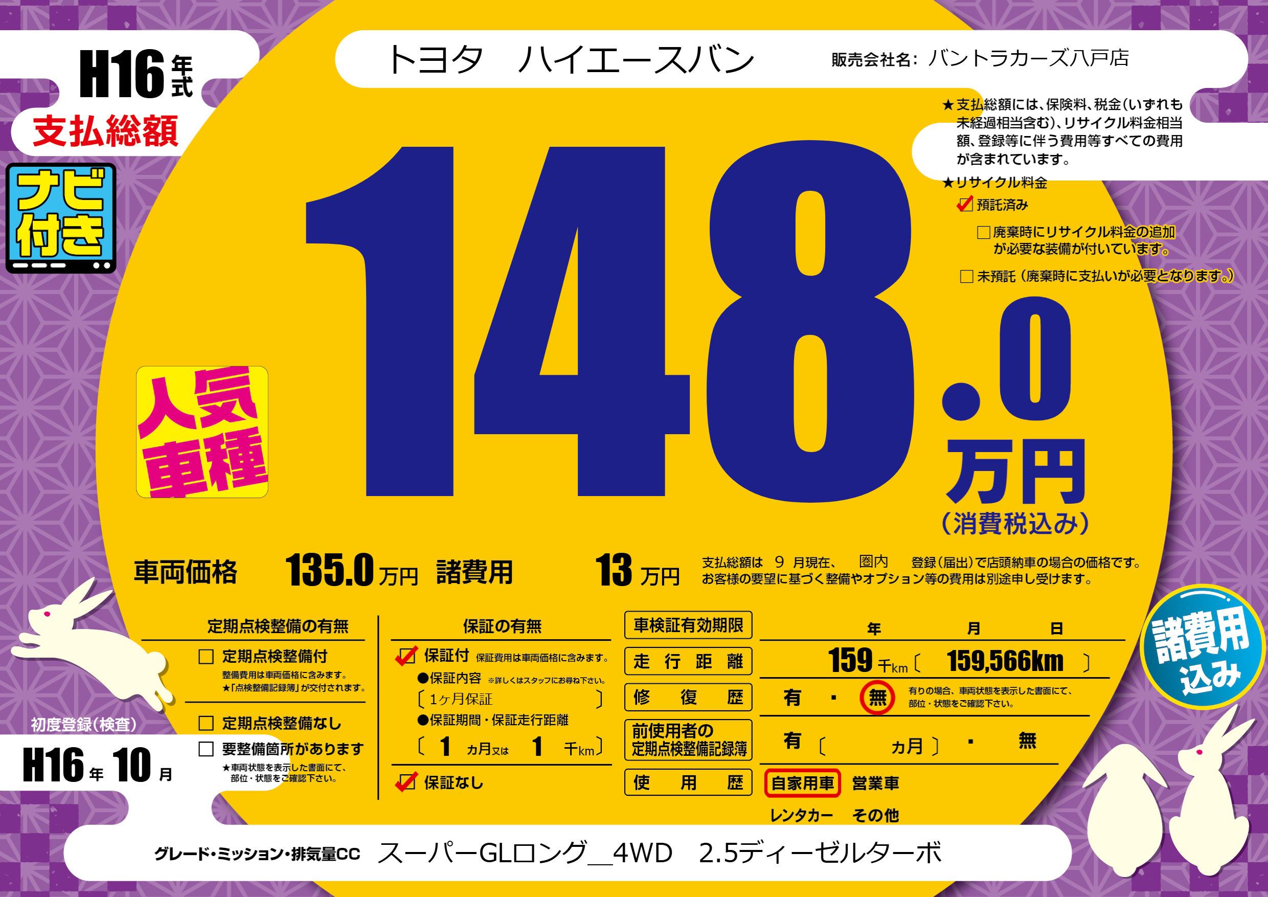 | 走行キロ | 15.9万km | 初年度登録 | H16年10月 |