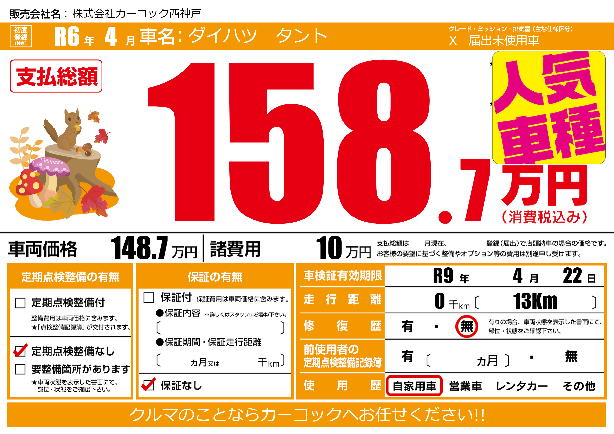 | 車名 | ダイハツ タント | グレード ミッション 排気量 |