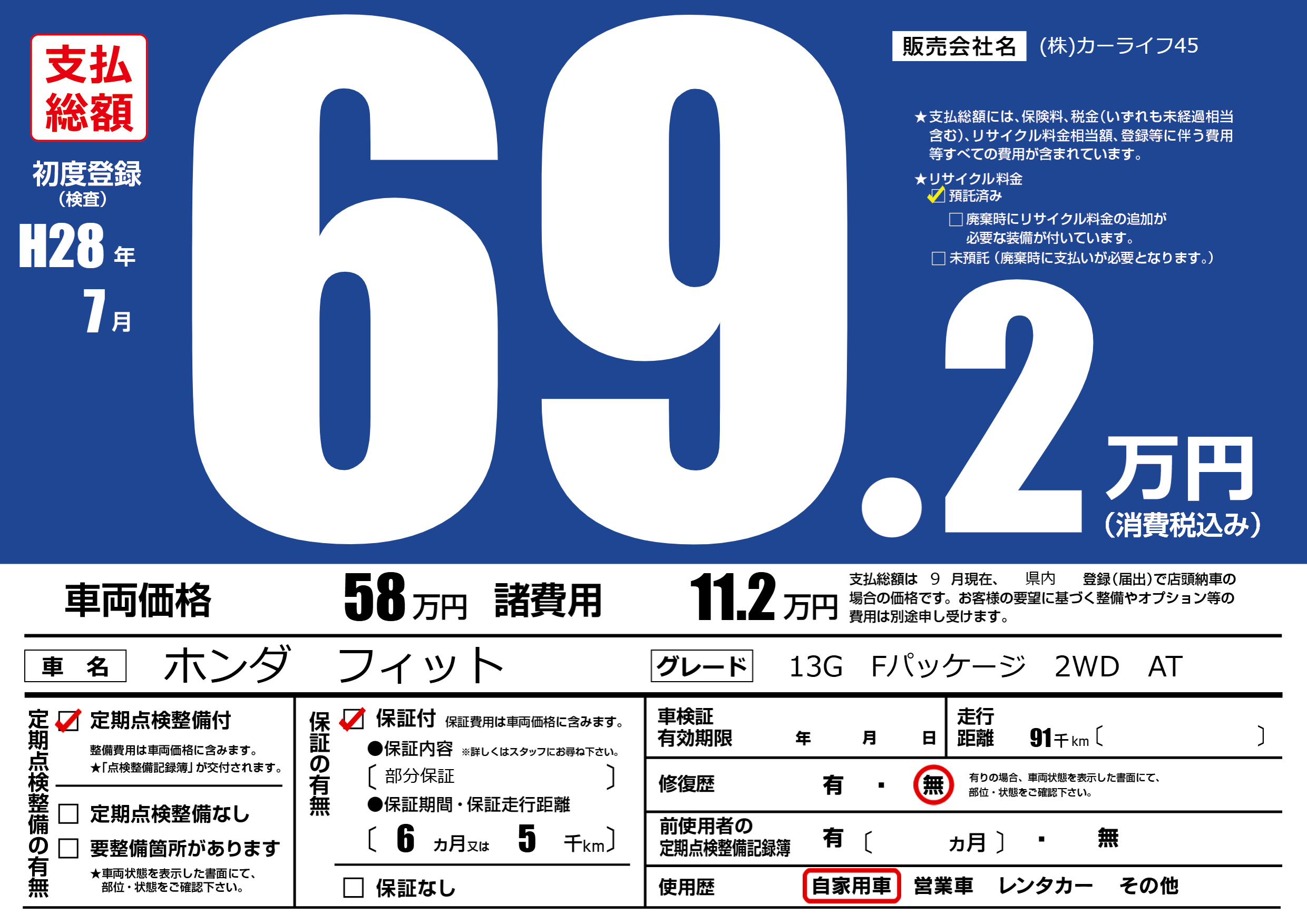 | 走行キロ | 9.1万km | 初年度登録 | H28年7月 |